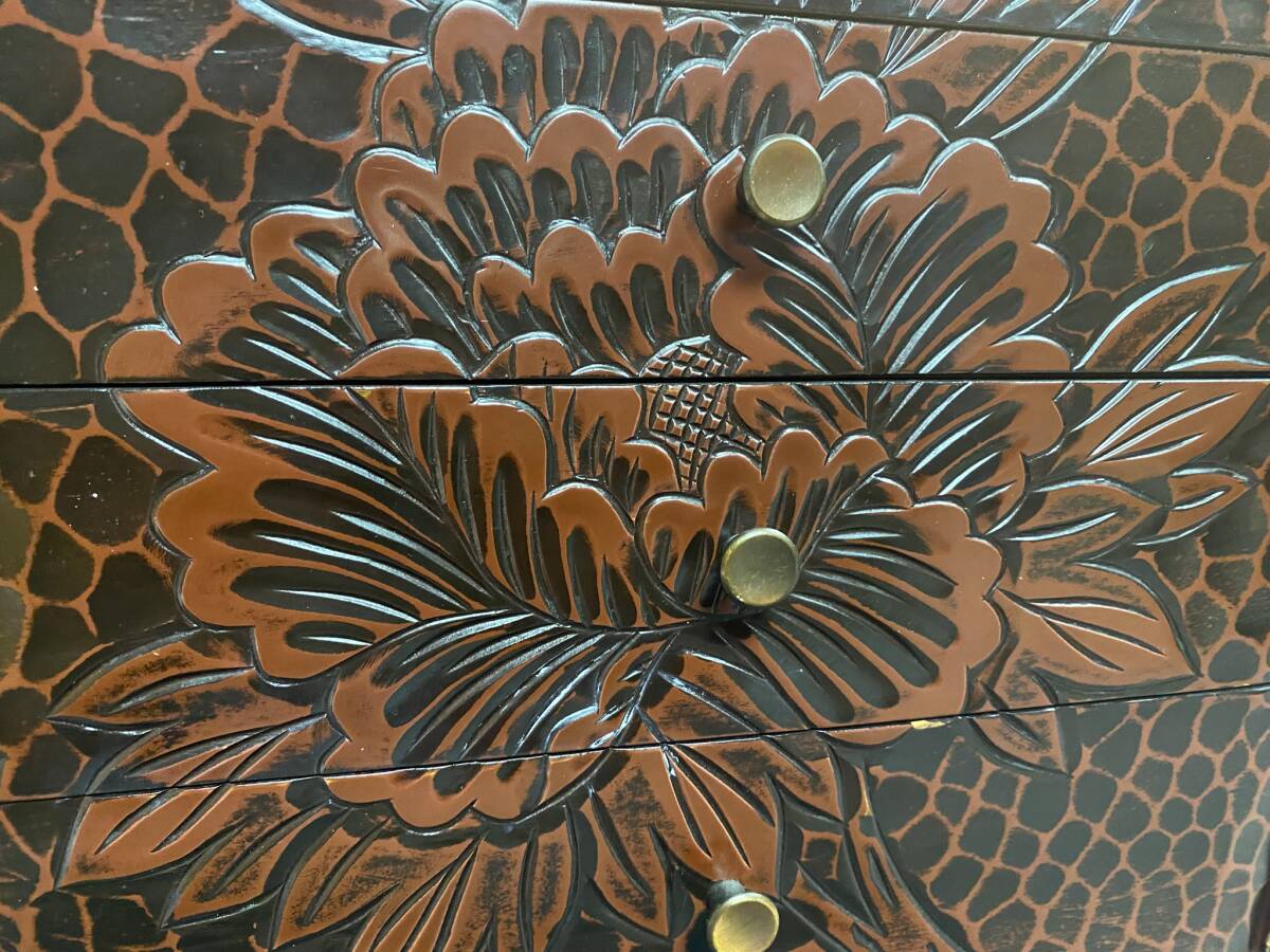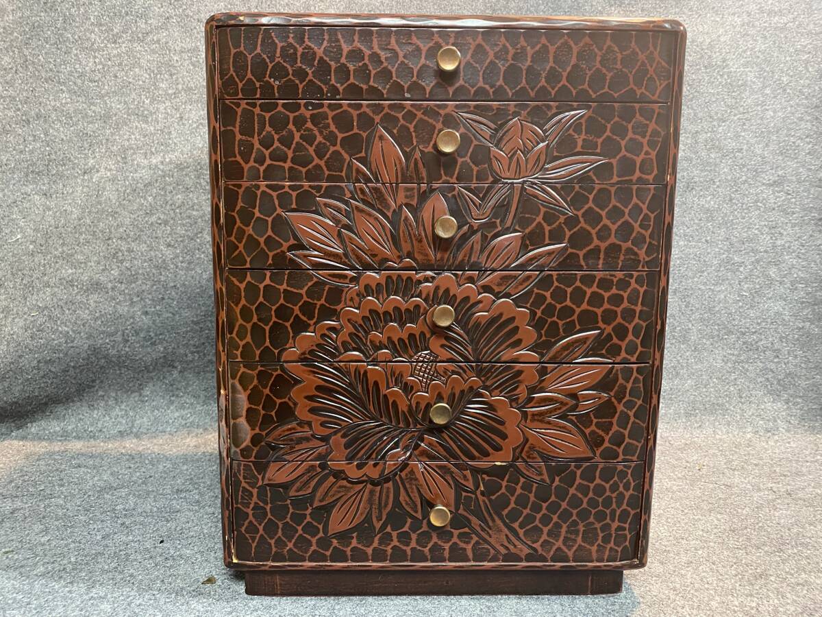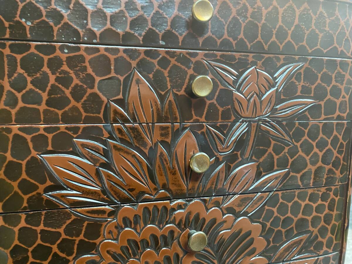 ご覧頂きありがとうございます。 【漆器】伝統工芸品 鎌倉彫 引き出し 小箪笥 小物入れ 高さ約39㎝ 横幅約30㎝ 奥行約26cm