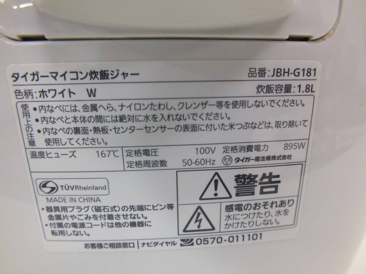 TIGER マイコン炊飯ジャー JBH-G181 2017年製 通電確認済 タイガー 炊飯器 一升炊き 1.8L ホワイト 炊きたて 炊飯ジャー 激安1円スタート