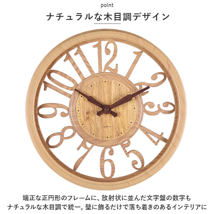| 商品説明 | ・・柔らかな木目調デザインで温かみのある空間を演出!北欧風モダンが素敵に叶う「木目調・壁掛け時計」が新登場。 ・【ナチュラルな木目調デザイン】 ・端正な正円形のフレームに、放射状に並んだ文字盤の数字もナチュラルな木目調で統一。壁に飾るだけで落ち着きのあるインテリアに。 ・【透明感のあるガラス面】 ・クリアなガラス面と文字盤の向こうが透けてみえる洗練されたデザインで、お部屋に奥行きとすっきりとしたこなれ感をプラス。 ・【夜でも安心の静音設計】 ・夜中でも時計のカチコチ音が気にならない「静音ムーブメント」を採用。寝室や子ども部屋、テレワークをするための書斎にも最適。 ・【北欧テイストにぴったり】 ・ウッディーな色合いが静かに流れるおうち時間に優しくフィット。北欧風の家具やインテリアと相性抜群! ・【お部屋に合わせて選べるカラー】 ・インテリアが明るく華やぐ「ホワイト」、大人シックな色合いが魅力の「ブラウン・コーヒー」など、お好みのカラーをチョイス可能。 ・【届いたら、すぐに使える】 ・時計背面には壁掛け用フック穴付きで取り付けもとっても簡単。(※クロックフックなど、専用の掛け具は付属しておりません。) ・単3形電池1本使用。(※電池は別売りです。) |