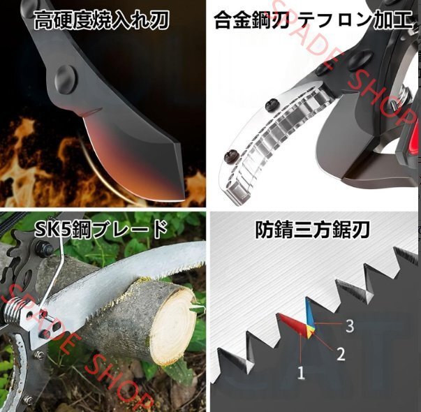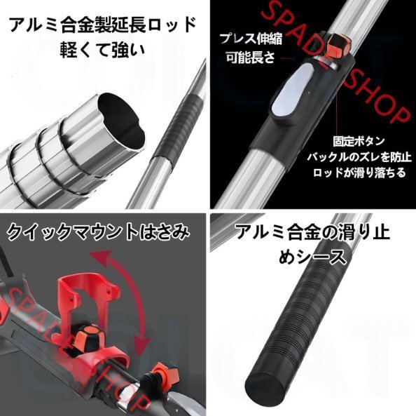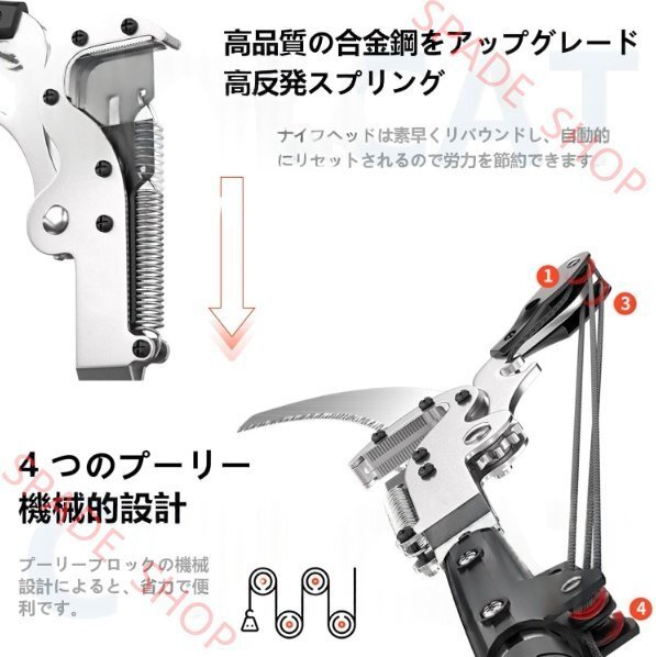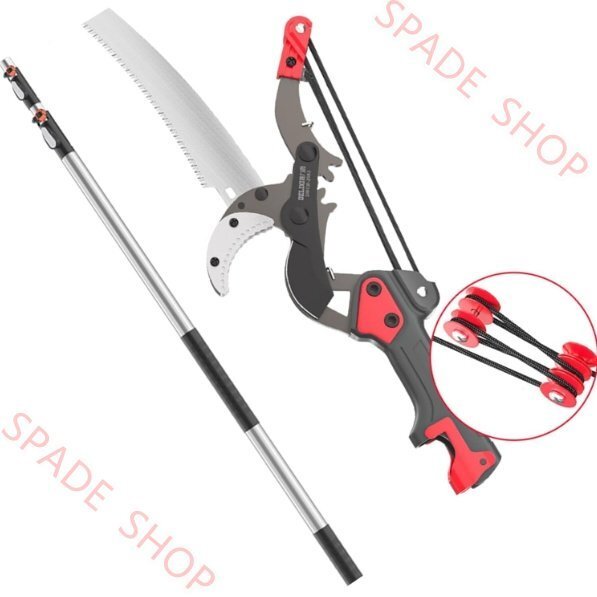 | 【製品仕様】 製品の長さ: 5m 【材料】 本体:SK5鋼 ハンドル:高強度アルミニウム合金 【特徴】 閉じた状態で刃先をロックできます。 取り付けが簡単な専用ノコギリが付属しているので、太い枝も楽々切断できます。 包丁とまな板の原理(押し切り原理)を利用し、最大45mmまでの生木の枝を切断できます。 コンパクトで軽量なので女性でも簡単にお庭の手入れができます。 薄い刃と金床でまっすぐきれいに切れ、包丁とまな板の原理で約45mmまでの枝も切断できます。 切断できない太い枝も切断できる、取り付けが簡単な専用ノコギリをご用意しましたので、太い枝も簡単に切断できます。 |