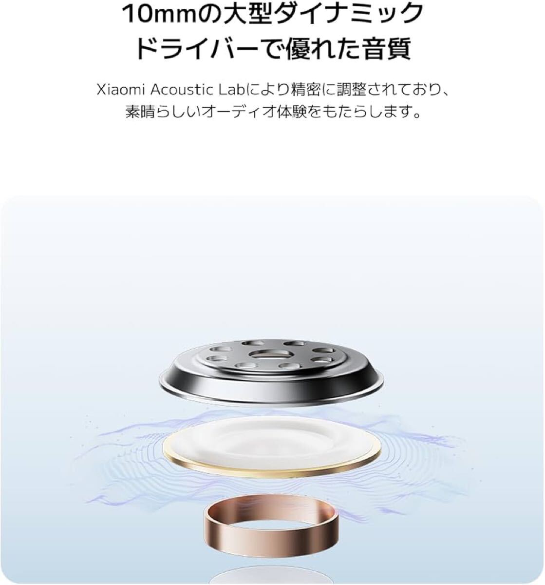 10mmダイナミックドライバー搭載:Xiaomi Acoustic Labによる精密チューニングで、力強くバランスの取れたサウンドを実現。5種類のプリセットEQでお好みの音質に調整可能。