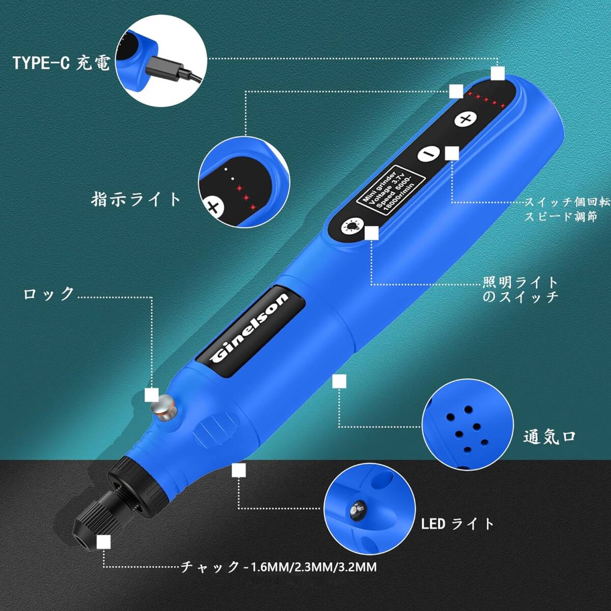 ミニルーター 5段変速 70PCS 18000RPM高速回転 照明ライト TYPE-C充電式 コードレス コンパクト 軽量 彫刻/穴あけ/研磨/切断/切削/つや出し/マニキュア/汚れ落とし 軽作業に向け 日本語取扱説明書付き B08FC9762H