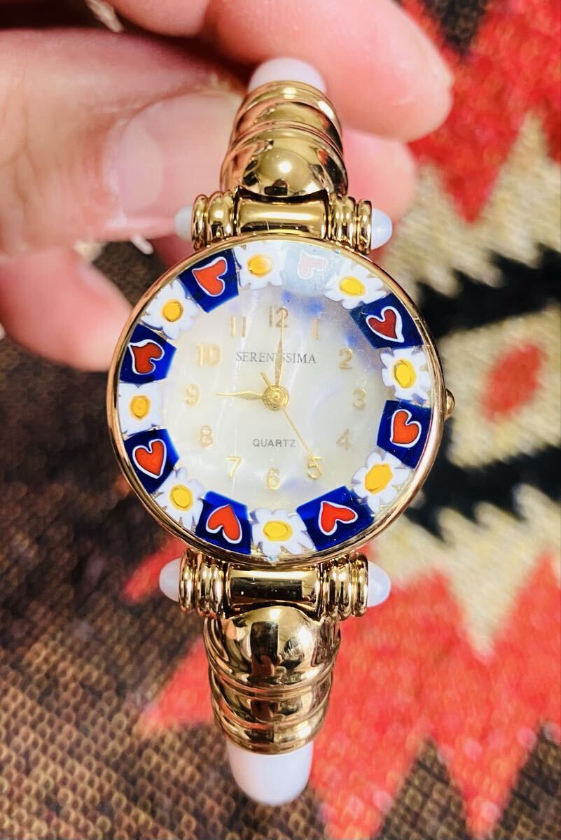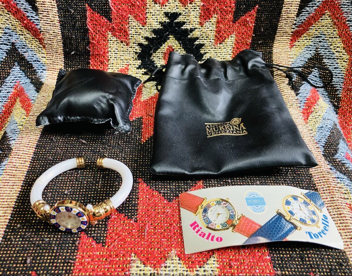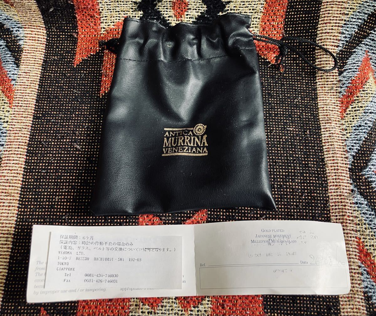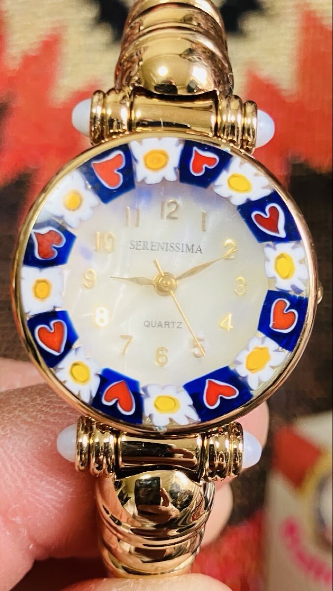 2,000年に母が、イタリア旅行に行った際にアンティカムリーナで買って来た、ベネチアンガラスを使用したセレニッシマのレディース腕時計です。未使用保管品で、保管袋と保証書付き。
