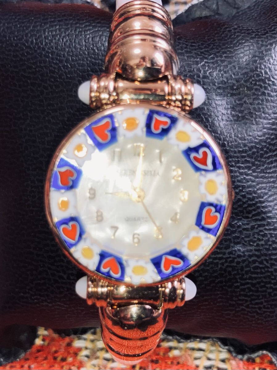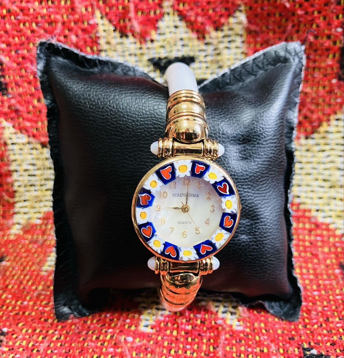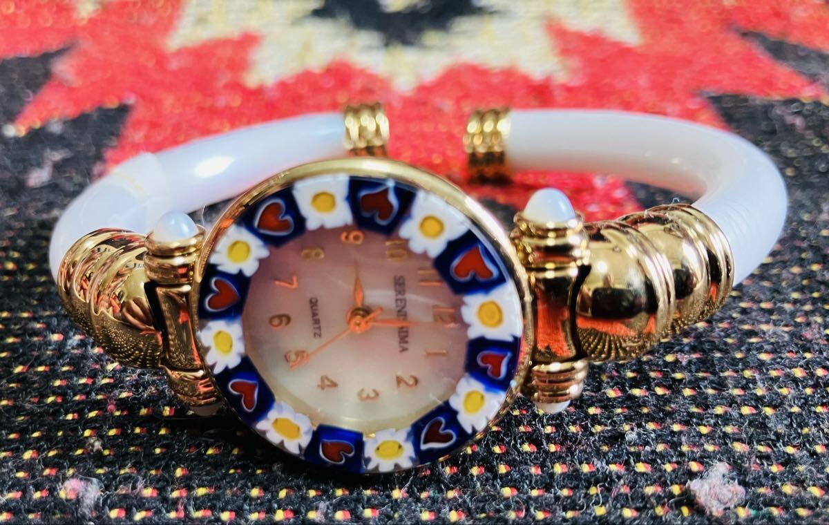 2,000年に母が、イタリア旅行に行った際にアンティカムリーナで買って来た、ベネチアンガラスを使用したセレニッシマのレディース腕時計です。未使用保管品で、保管袋と保証書付き。