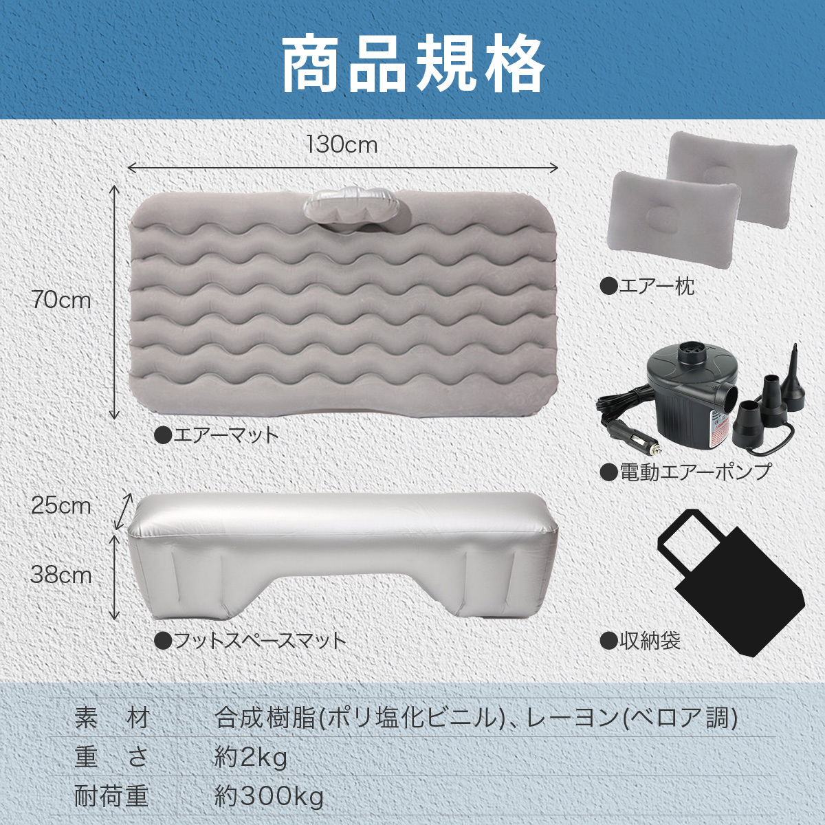 ・サイズ:(エアーマット本体)130×70cm、(フットスペースマット)130×25×38cm