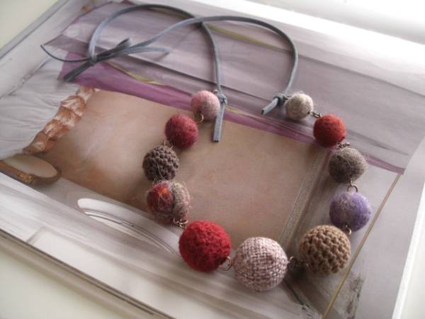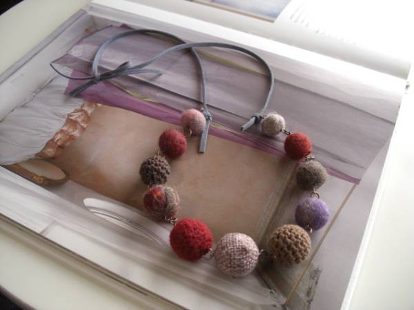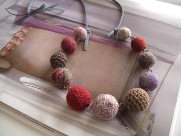 色で遊んで・・シリーズです♪ピンク・セレクト・・ふんわりやさしい春色の異素材のネックレスです♪10ミリから20ミリ位までのベージュやモーヴピンク、ボルドーやブラウン、ダークレッドの編みボールやフェルト玉を集めました♪ブルーグレーのスェード紐を合わせて甘すぎない大人のロマンチックしています♪ネックレスの長さは全長90センチ位です♪短く結んでチョーカー風にされても素敵です♪お揃いのブレスレットも出品しています♪ハンドメイドをご理解いただいてノークレーム・ノーリターンでお願いします♪