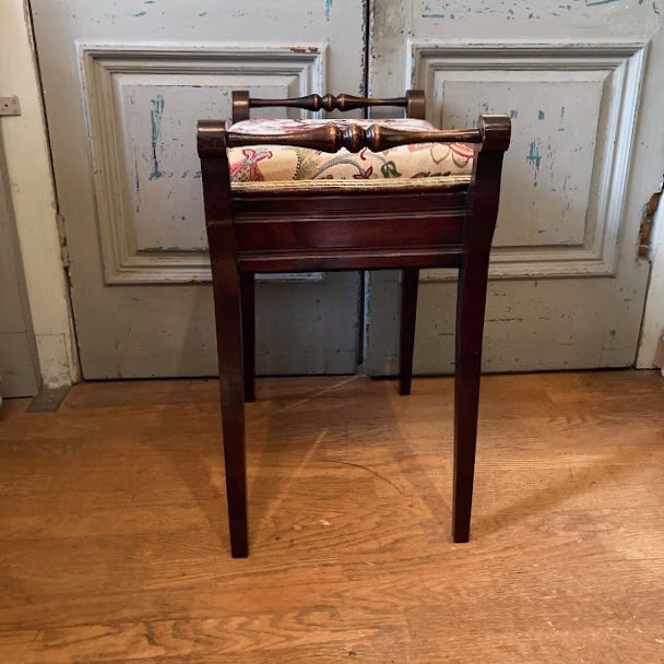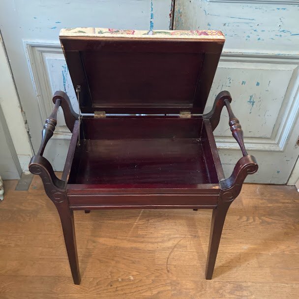 クッション部分はイギリスの生地で張替済みのため、安心してご利用いただけます。収納内はA4サイズの紙が2枚入るくらいの大きさで、楽譜や雑誌などを入れるのに便利ですよ。玄関やリビング、店舗などでもちょっと座りたいな!と思うところに1台あると便利です。左右にハンドルも付いているので、立ち上がる時に安定感があります。側面には曲線の流れるような模様が彫刻されています。長く大切に使用されていたことで独自の使用感がありますが、それがアンティークの味わいになっています。