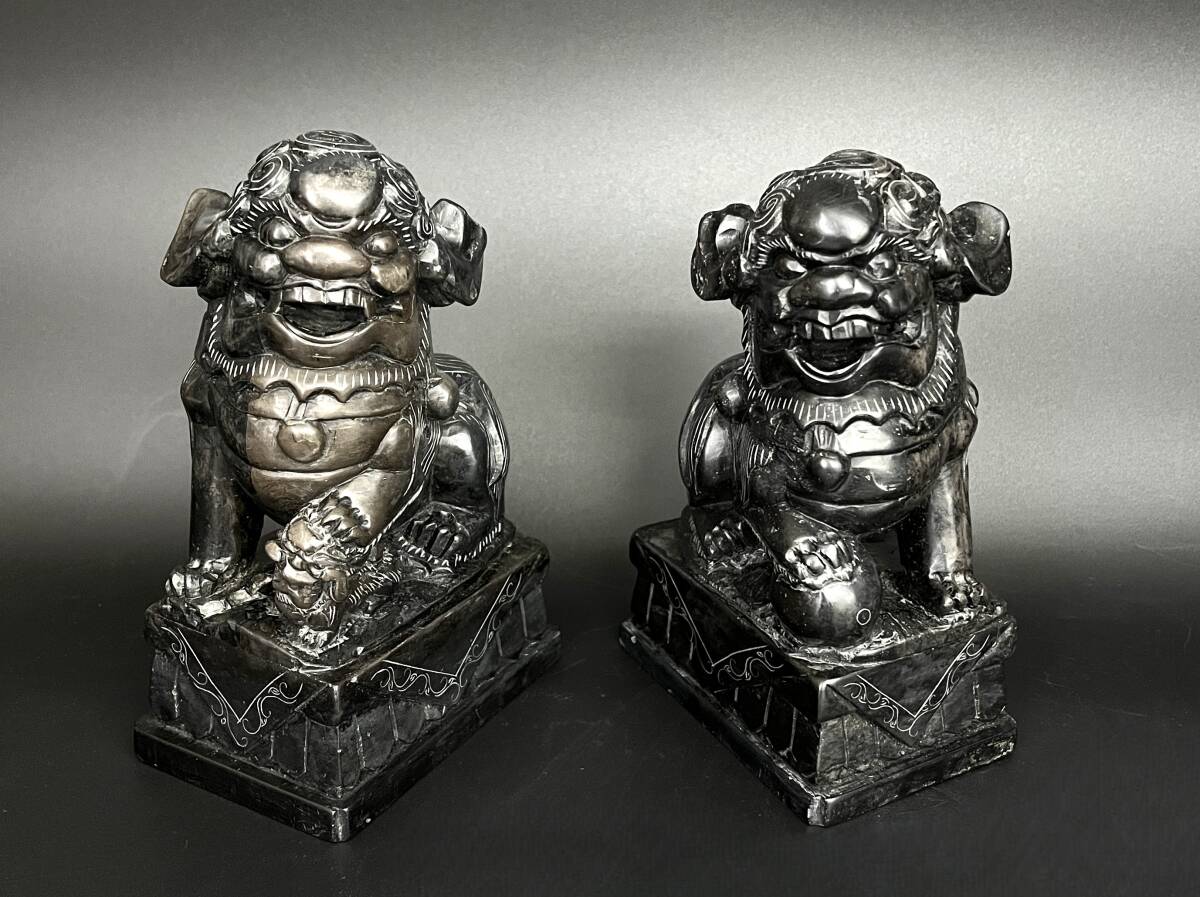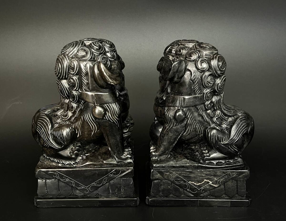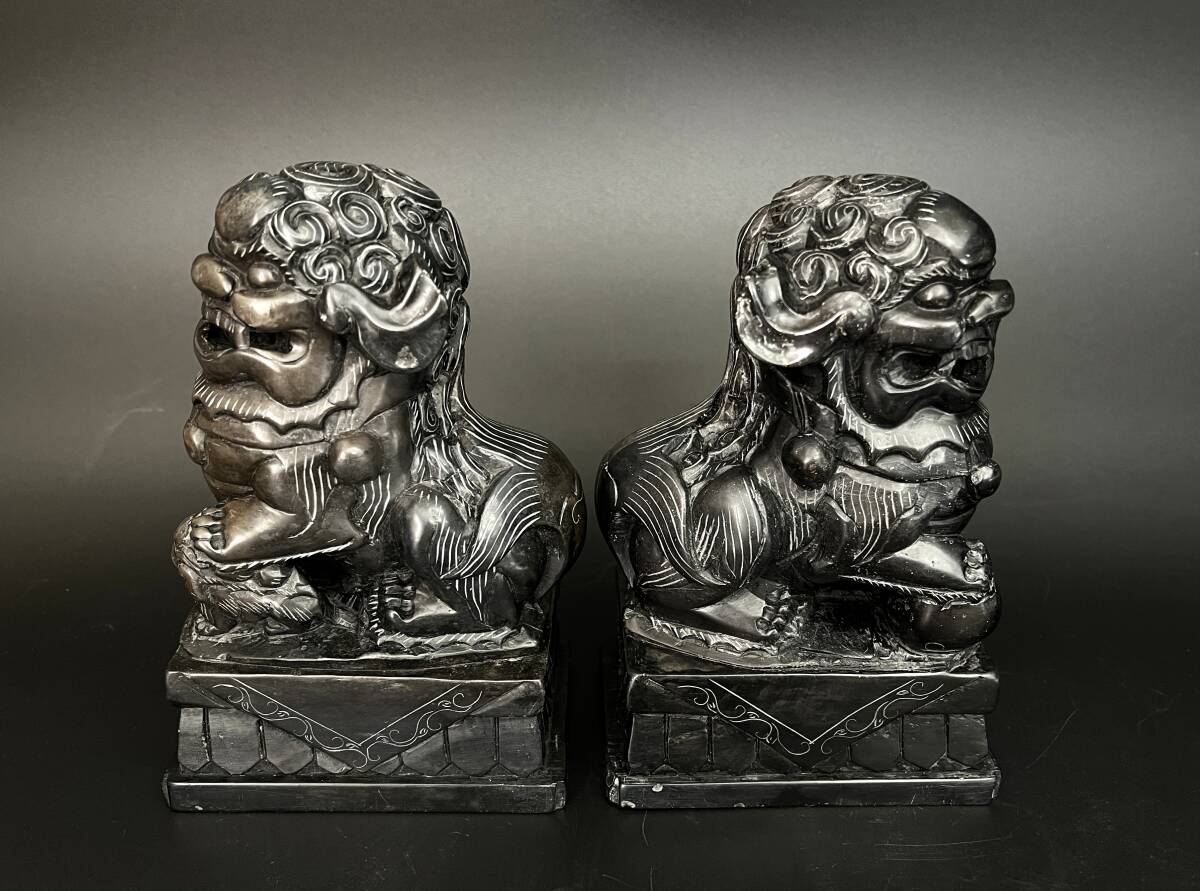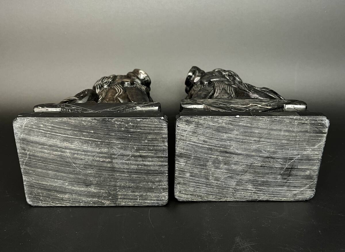 【状態】 こちらの商品は年月を経た商品のため、スレ傷、薄汚れ、あたりキズなどがございます。 素材は詳しくは分かりかねますが硯に使われているような感じの石です。 二体とも中央に筋が見えます。そこで石の色味が変わっています。 状態は画像でご確認の上、ご理解頂ける方のみご入札下さい。 サイズ:約幅7×奥行11×高さ15.5cm(台含む) 重量:約2.86㎏ ※素人採寸ですので、若干の誤差はご容赦下さい。 ◆この他にも様々なアイテムを多数出品しております。◆ ぜひご覧下さい。 ■トラブルを避けるため、神経質な方や完璧なお品を求められる方は入札をお控え下さい。 | ||