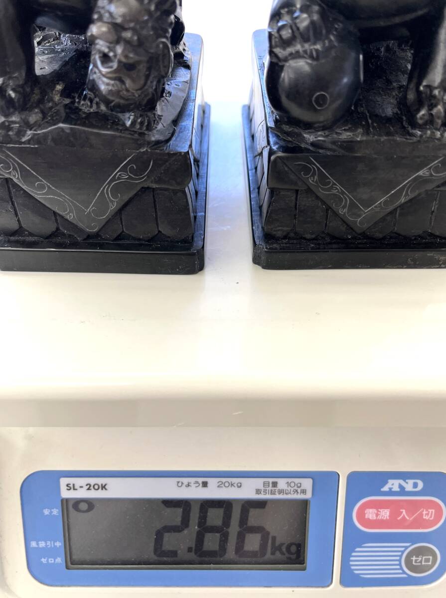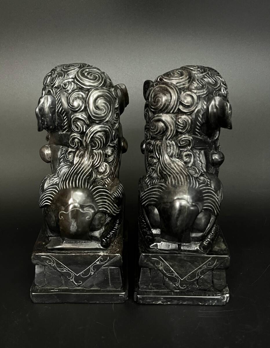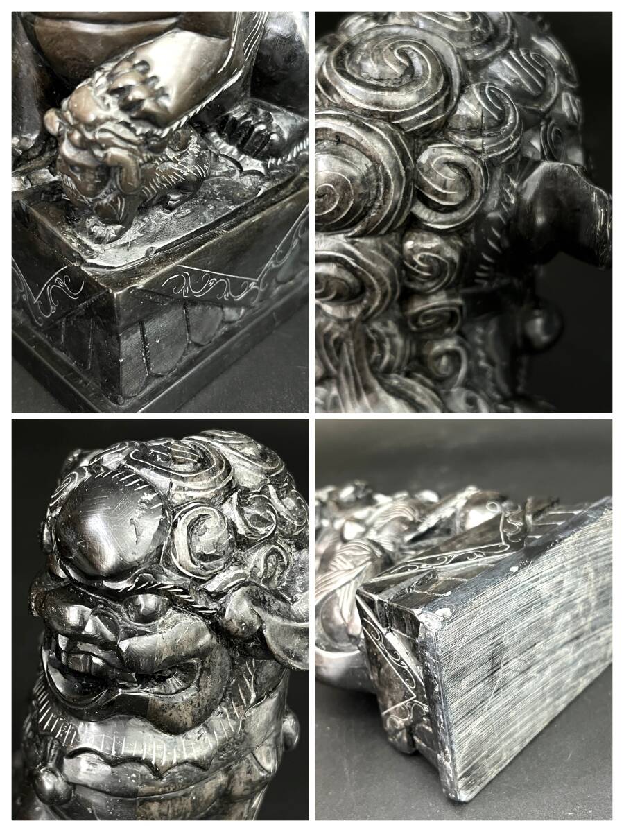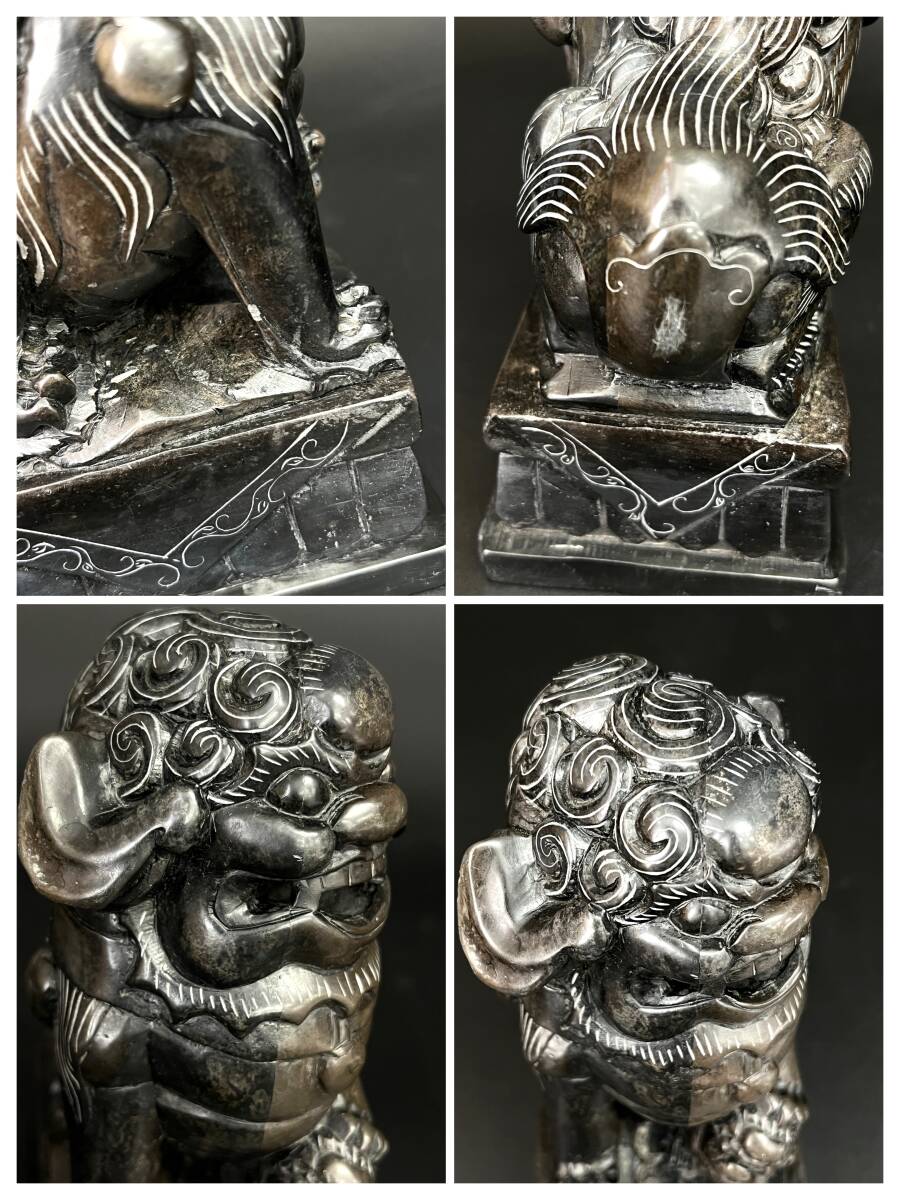 【状態】 こちらの商品は年月を経た商品のため、スレ傷、薄汚れ、あたりキズなどがございます。 素材は詳しくは分かりかねますが硯に使われているような感じの石です。 二体とも中央に筋が見えます。そこで石の色味が変わっています。 状態は画像でご確認の上、ご理解頂ける方のみご入札下さい。 サイズ:約幅7×奥行11×高さ15.5cm(台含む) 重量:約2.86㎏ ※素人採寸ですので、若干の誤差はご容赦下さい。 ◆この他にも様々なアイテムを多数出品しております。◆ ぜひご覧下さい。 ■トラブルを避けるため、神経質な方や完璧なお品を求められる方は入札をお控え下さい。 | ||
