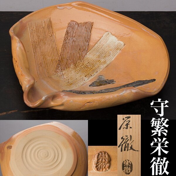 | 守繁栄徹、「萩扇形菓子器」。共箱あり。真作保証。 サイズは、幅約26x27.5cm、高さ約5cmです。 傷・直しございません。 |