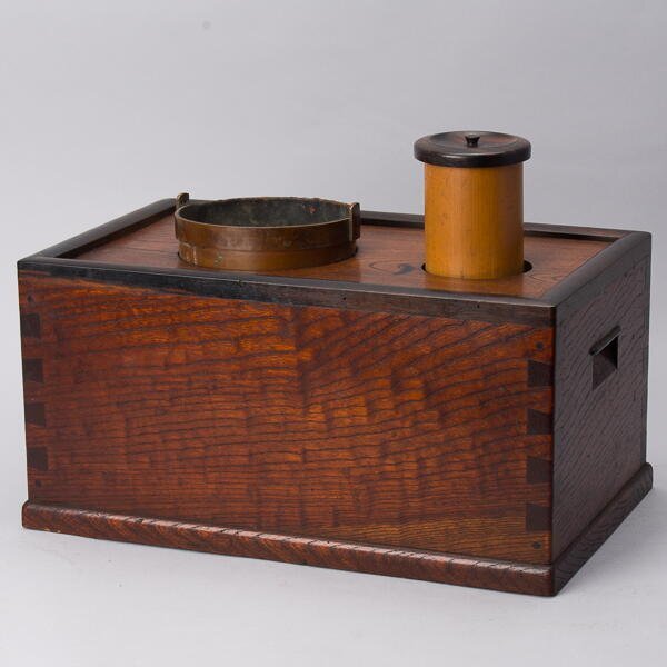 | 欅の古い煙草盆。 杢の美しい欅材です。もちろん無垢材が使われています。 サイズは、幅35.5x21.5cm、高さ約18cm(火入・竹筒を含まず)。 火入の持ち手は本来2本一対ですが、1本失われていて、残る1本の手も 取り付けのためのピンが片方失われています。 竹筒の底、穴あります。 経年のアタリ・スレあります。 状態・詳細は、画像でご確認お願いいたします。 |