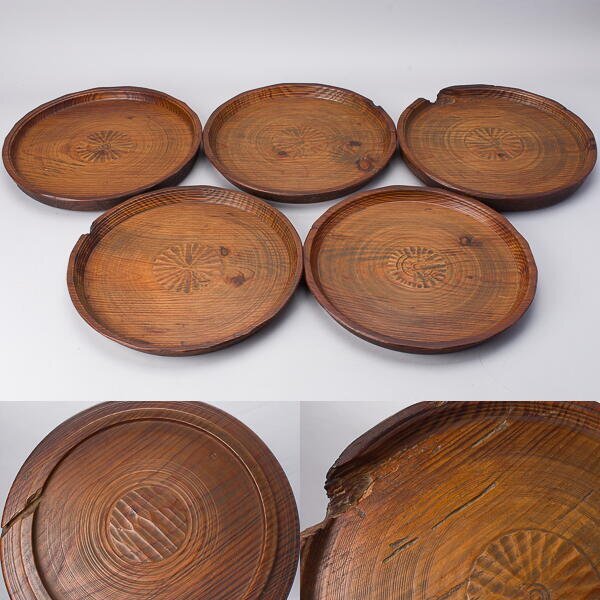 | 肥松盆5枚。箱無。 古材を用いたものと思いますが、共箱や焼印もありませんし、どこの古材か 私には分かりかねます。 5枚揃同手の盆ですが、裏の作りは3枚が幅の広い接地面を持ち、2枚は 高台状の作りになっています。 また、4枚は銘有りで1枚は無銘です。 銘は「國」、もしくは四角枠に「或」と思いますが、私には作者等詳細は 分かりかねます。 サイズは、幅約31.5-32.5cm、高さ約3-4cm。 ガタはありません。 状態、詳細は画像でご確認ください。 |