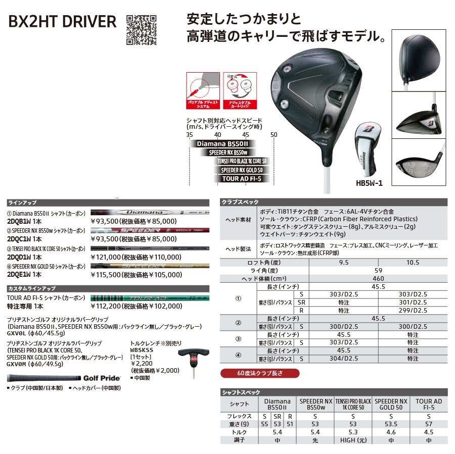 【2025年 BXシリーズ】 新品 ブリヂストン BX2HT ドライバー 10.5° 純正カーボン Diamana BS50Ⅱ (SR) 日本仕様 |