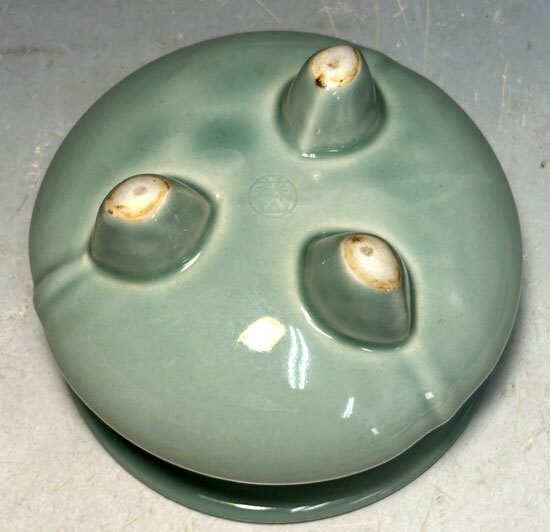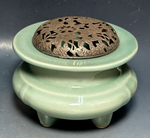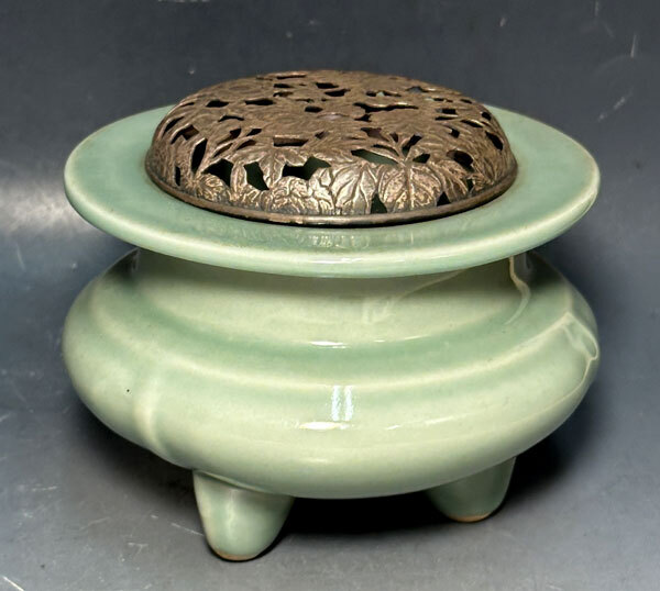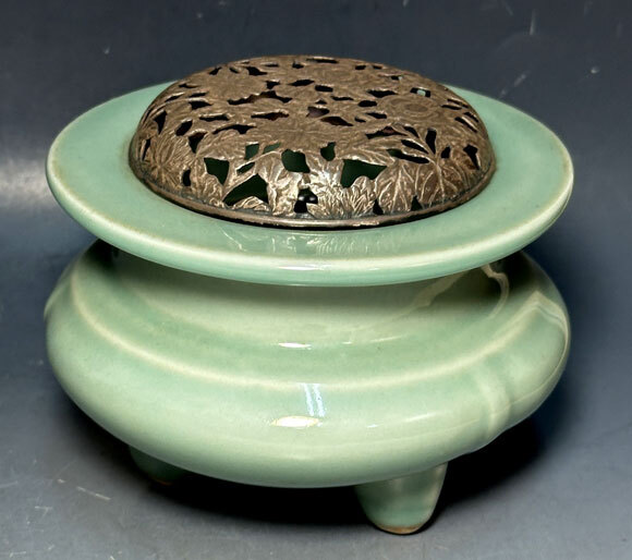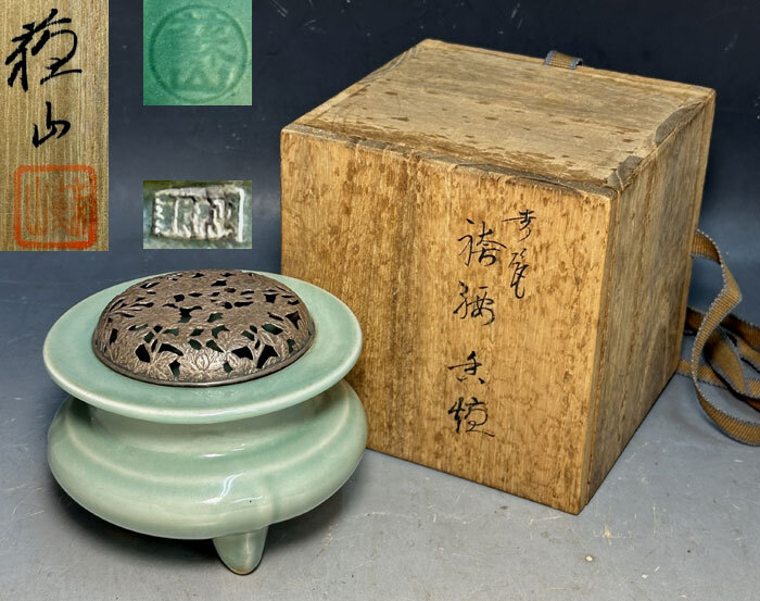 | ★夢浪漫★諏訪蘇山 青瓷袴腰香炉No13 純銀蓋透彫 三足 香爐 共箱 | |