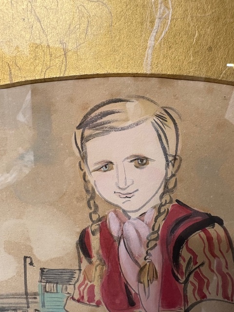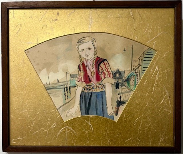【真作】田村 孝之介 「和蘭陀娘」扇面 水彩 サイン入り 額装 芸術院会員 文化功労者 二紀会理事