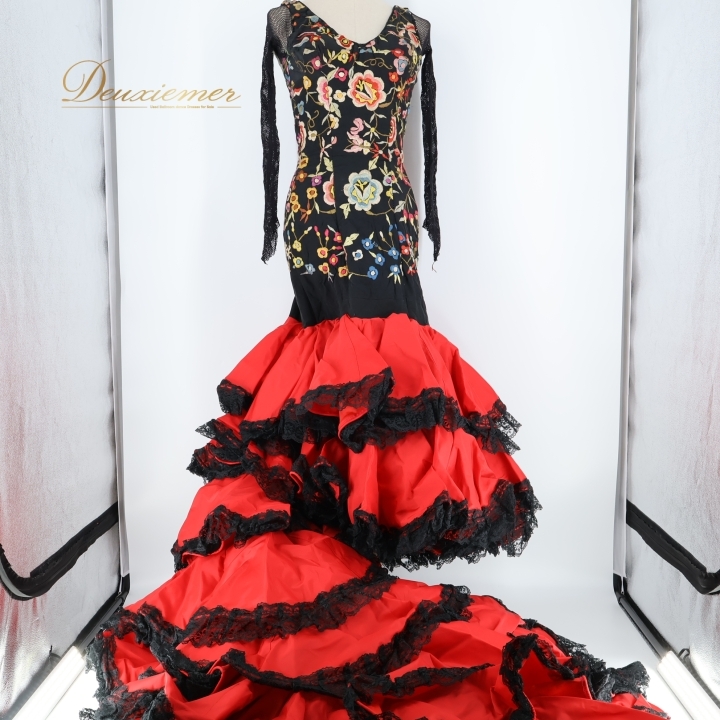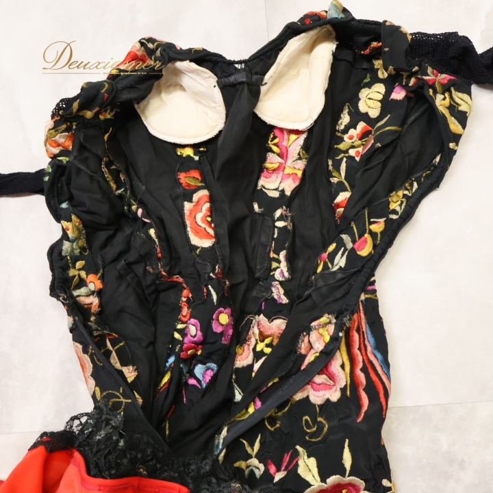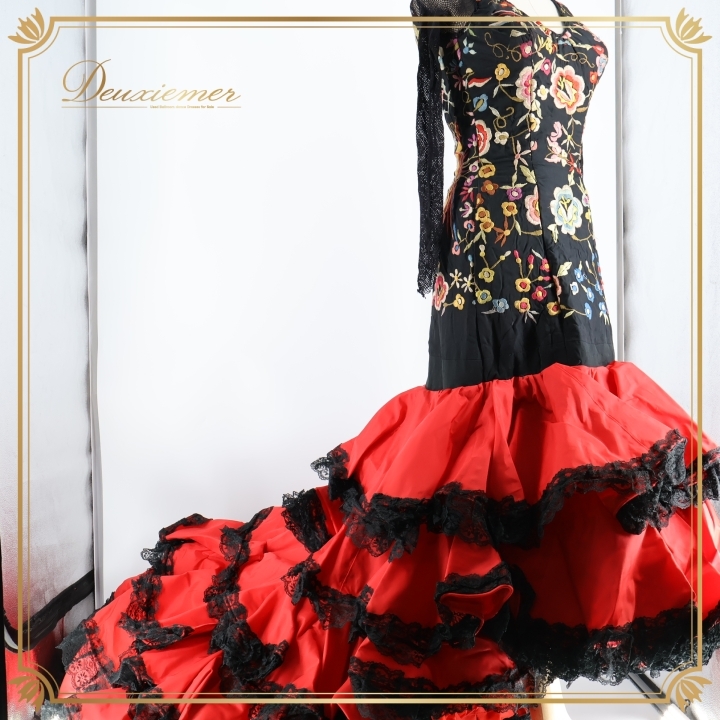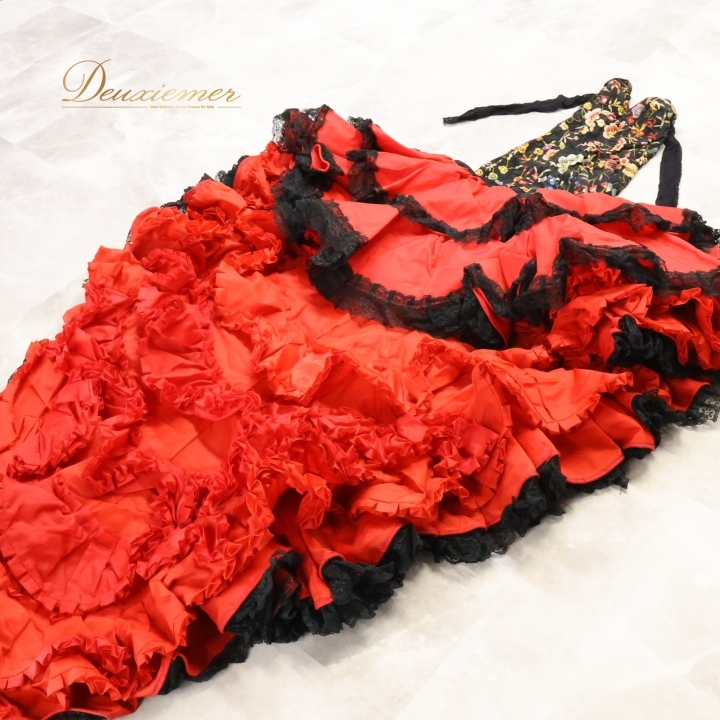 | 【商品名】フラメンコ 衣装 バタデコーラ ワンピース ドレス 【サイズ】表記無し 平置き実測:総丈背面約230cm(裾~肩部まで)、総丈正面約116cm(裾~肩部まで)、身幅約34cm、ウエスト約29cm ※実測の為、多少の誤差はご了承ください ※7号のトルソーにぴったりくらいのサイズ感です 【仕様】 ・背面ファスナー仕様 ・腕、肩回りのみ伸縮性有り ・肩パッド無し ・胸パッド有り 【品質表示】 表示無し ------------------------------------ 【ポイント】 ▽どっしり重みのあるドレス ▽刺繍&段々レースが豪華なデザイン ------------------------------------ 【撮影時使用トルソー】 種 類:女性用トルソー7号 サイズ:肩先~床約135cm(身長約160cm)、肩幅約37cm、バスト約83cm、ウエスト約60cm、ヒップ約81cm |
