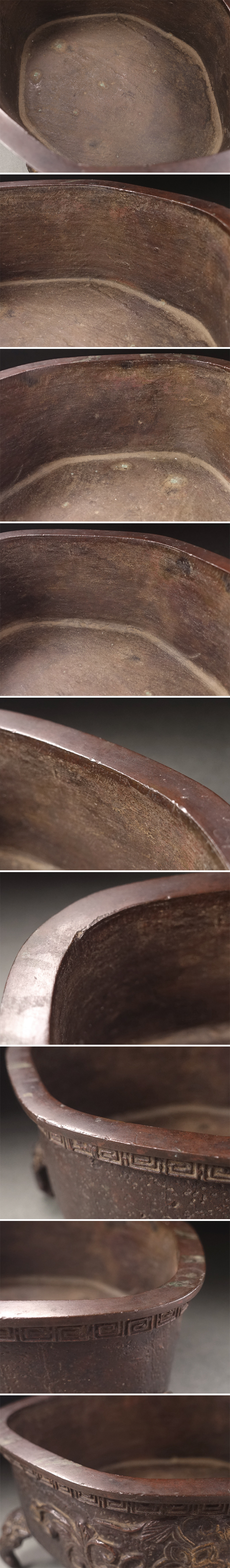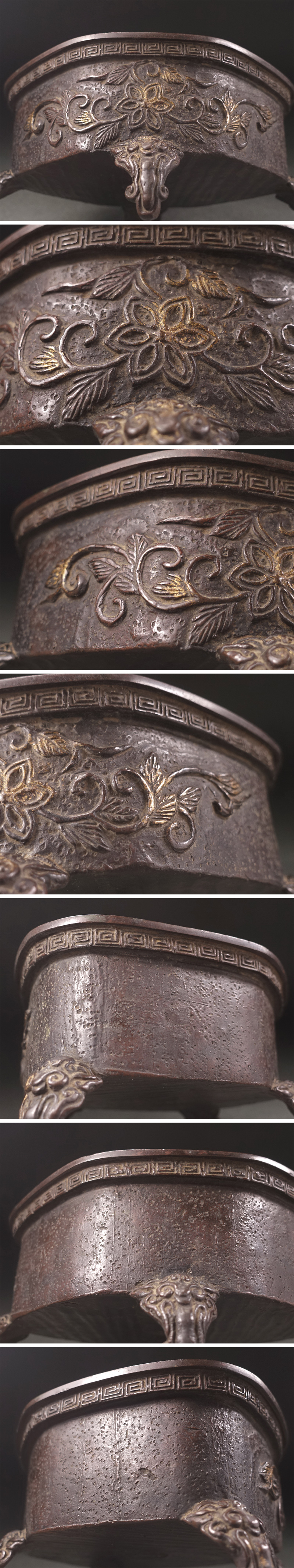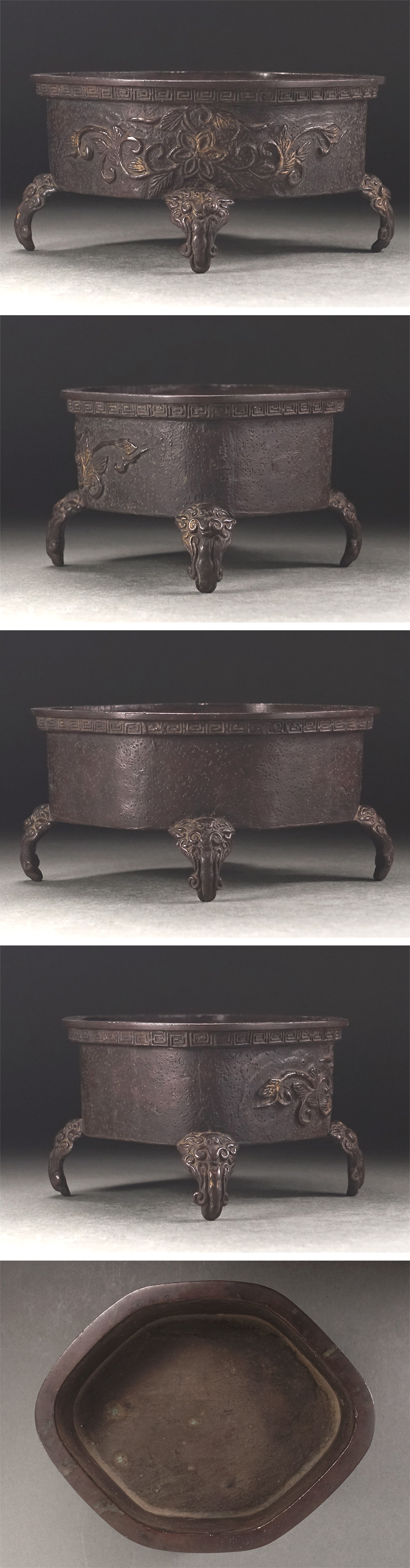 六角形に獣足を備えた荘厳な砂鉢で、古格を備えた銅肌に華麗な花唐草を意匠した上で金鍍金を施しています。