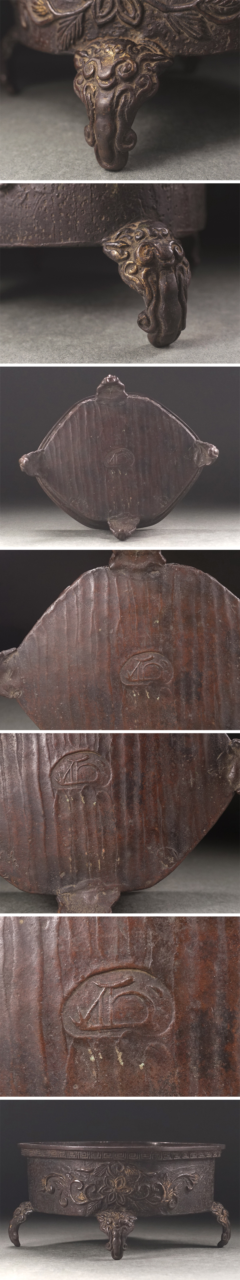 本物保証!    古銅金鍍金花唐草文獣足六角砂鉢です。