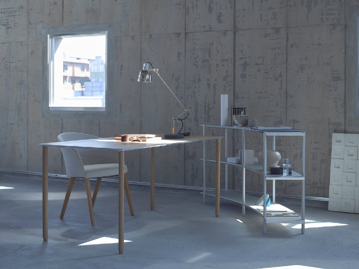 天板と同じく梨地を仕様した傷耐性の強いレッグスも最低限度まで細めたミニマムデザインを貫いており、アーバンな機能美を追求しています。