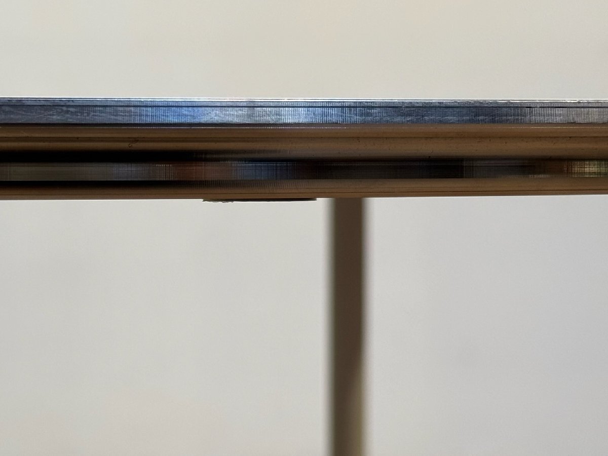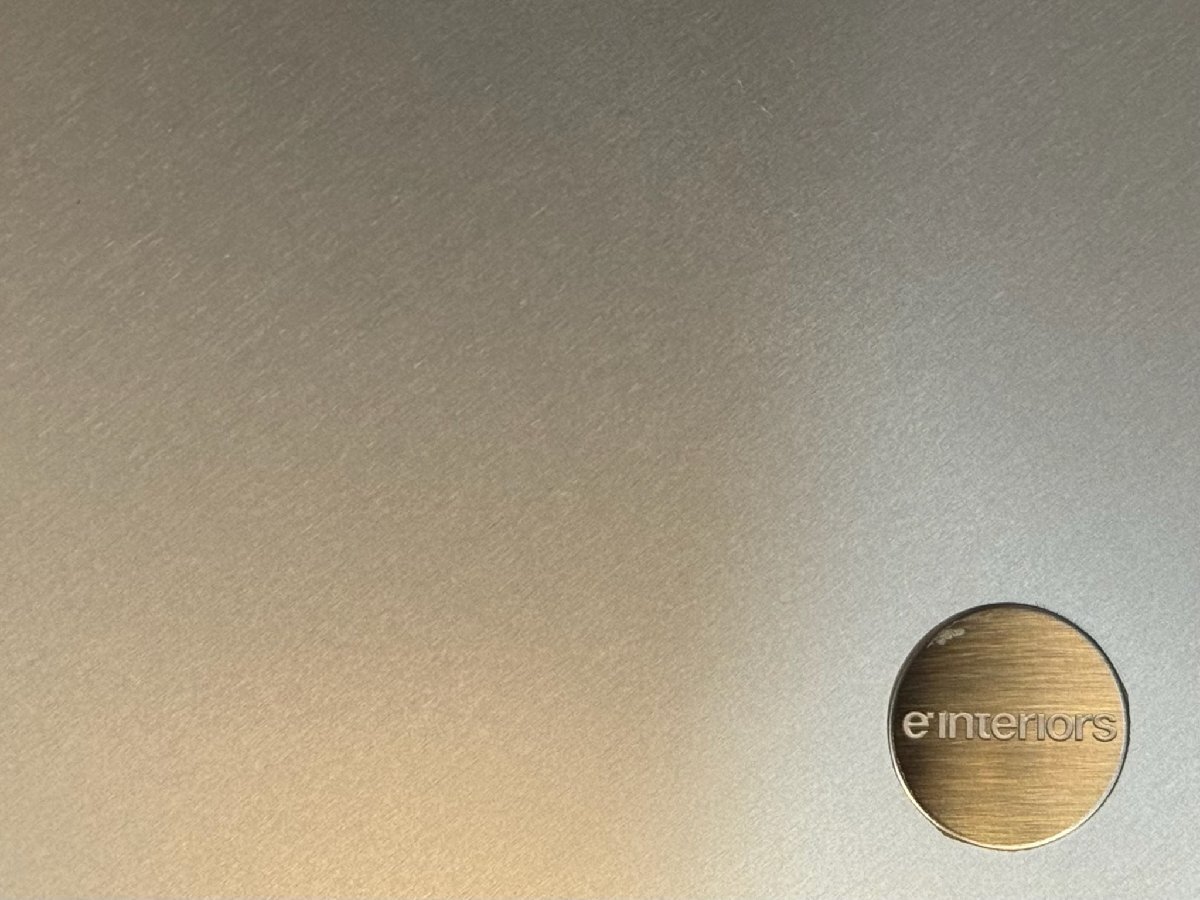 スリムさを追求した天板は、構造を支える上で必要な厚みは中央に狭めることでエッジ部をシャープに演出、エッジーなテイストにシルバーの天板サイドが美しいチャームになっています。
