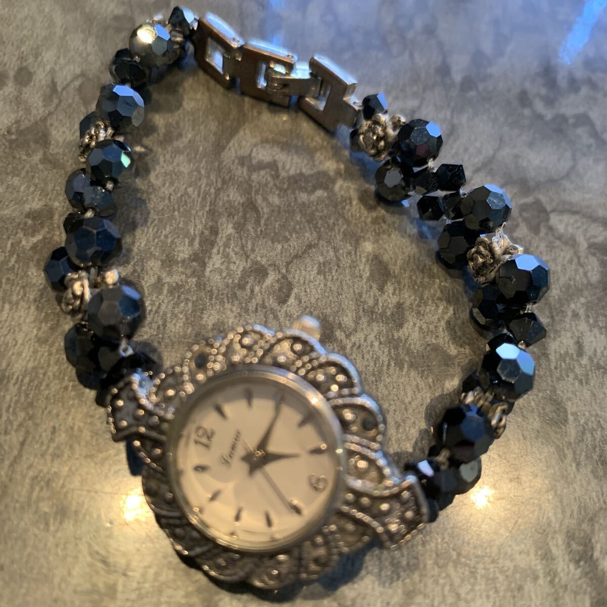 針は止まっています。黒いストーンがキラキラ光って綺麗です。