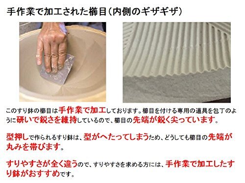 日本でも有数のすり鉢専門メーカー、元重製陶所製 国産品 職人が一つ一つ手作業で入れた、すりやすい櫛目(内側のギザギザ) 裏面にすべり止め付き(シリコンゴム) 片手でも作業可能&テーブルを傷つけにくい! 器としても使える 和食によく合う深い緑色 すぐに使えるすりこぎとのセット すりこぎは国産の天然木使用 和え物を作るには少し小さいが、ドレッシング作りには最適のサイズ