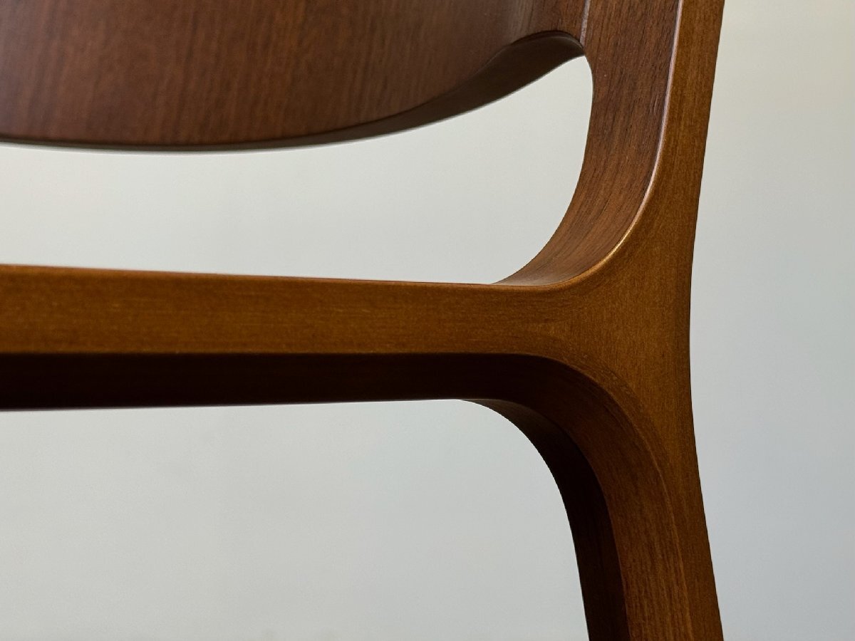 プライウッド成形による柔軟なしなり強さを高らかに謳いあげたほっそりとしたフレーム構成の美しい連なりは、独特の凛とした緊張感を帯びており、プロダクト名に冠った "RINN / 凛" の名を体現していて秀逸。
