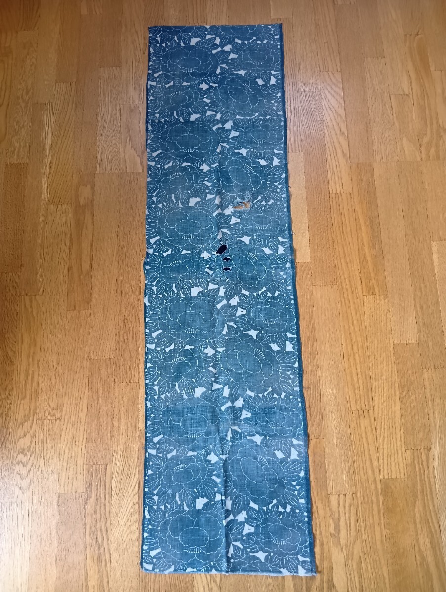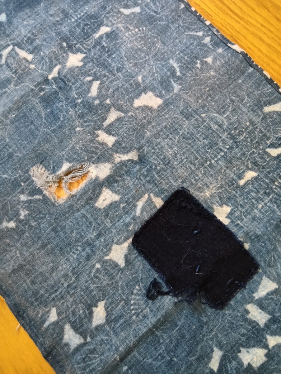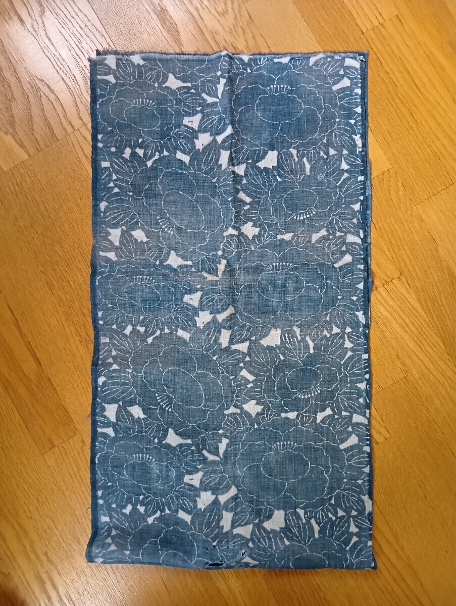 酒屋さんのイベントで購入したものです。100年以上前のものとお聞きしました。つぎはぎや穴は購入時からのものです。恐らく藍染だと思いますが詳しいことはわかりません。