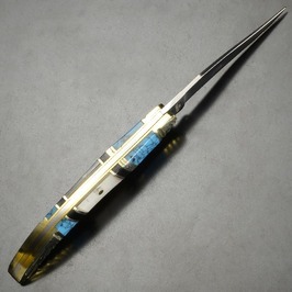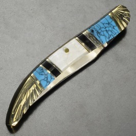 ブールーターコイズとマザーオブパールをはめ込んで作られた、鮮やかで伝統的な形状のグリップ。