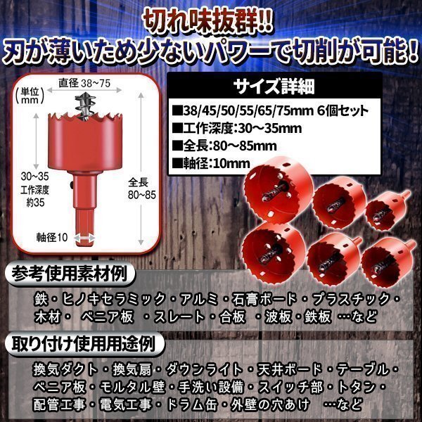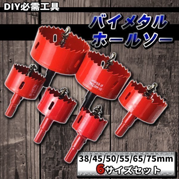 バイメタルホールソー ホルソー 6本 セット 38 45 50 55 65 75mm ドリル 工具 穴あけ ビット ステンレス 金属 用 木工