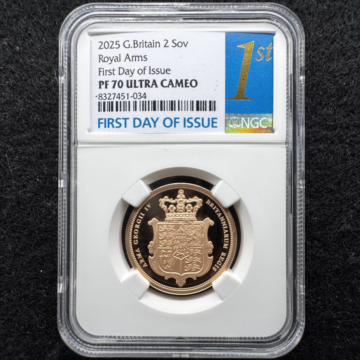 『幸運と美しさを引き寄せるご褒美 最高鑑定』2025年 イギリス ロイヤルアームズ 2ソブリン 金貨 NGC PF70 ULTRA CAMEO First Day of Issue