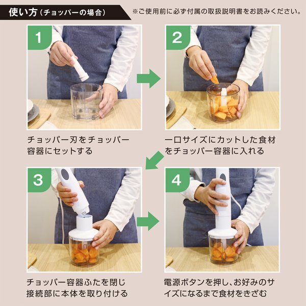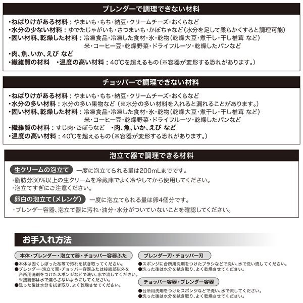 ※本体は防水仕様ではありません。本体の丸洗いは絶対にしないでください。(ブレンダー刃・チョッパー刃・チョッパー容器・ブレンダー容器は丸洗いできます。)