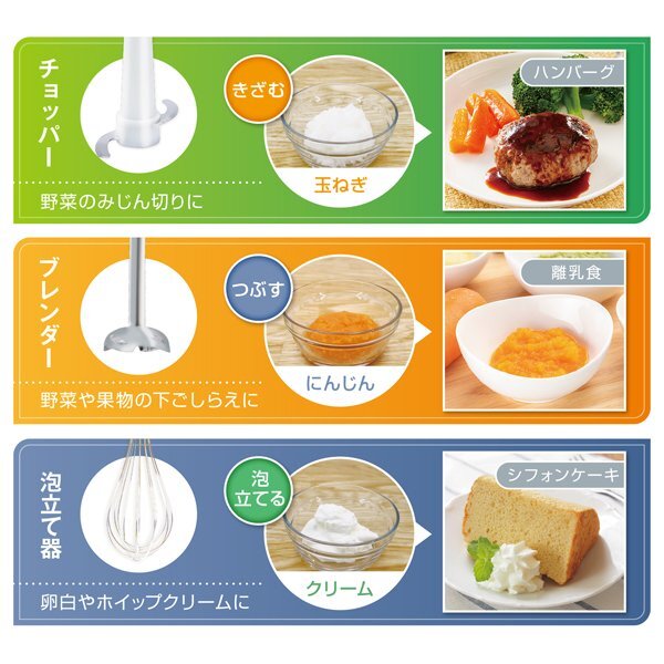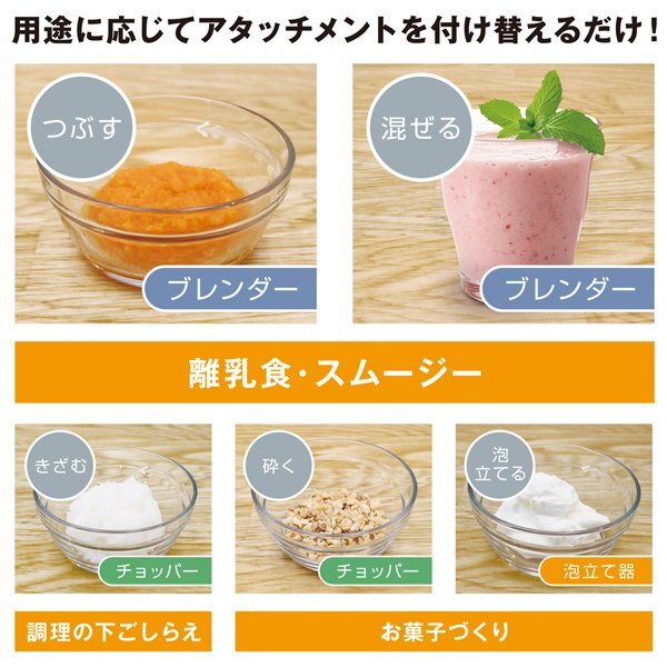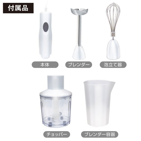 本体、チョッパー容器、チョッパー容器ふた、チョッパー刃、ブレンダー、ブレンダー容器(600ml)、泡立て器、保証書、取扱説明書