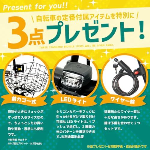 【プレゼント】カゴ一式(カゴ固定ブラケット・カゴ足含む)・ワイヤー錠・LEDライトを特別にプレゼント! ※初期不良・返品対象外