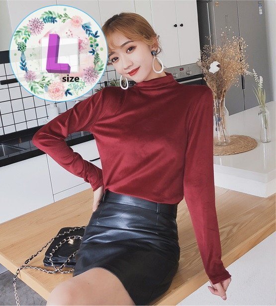 1スタ☆良質とろみベロア素材 ハイネックカットソー Lサイズ 美ライン 長袖 レディース タートルネック ロンT 無地 綺麗め K-091-6ワインレッド