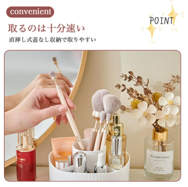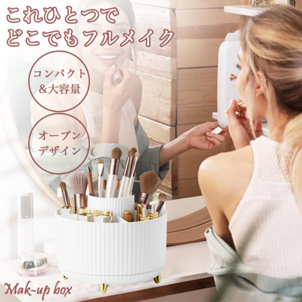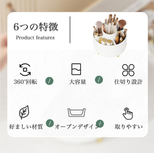 【回転式デザイン】360°回転式で、取り出しやすい。細かく仕切られている上部プレート、コスメやメイク道具など小物を整理して収納できる便利な卓上収納。