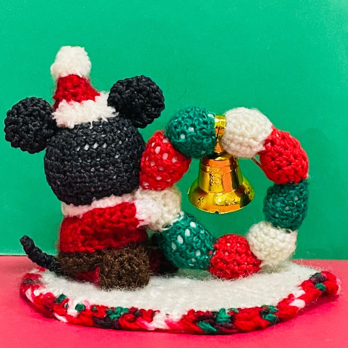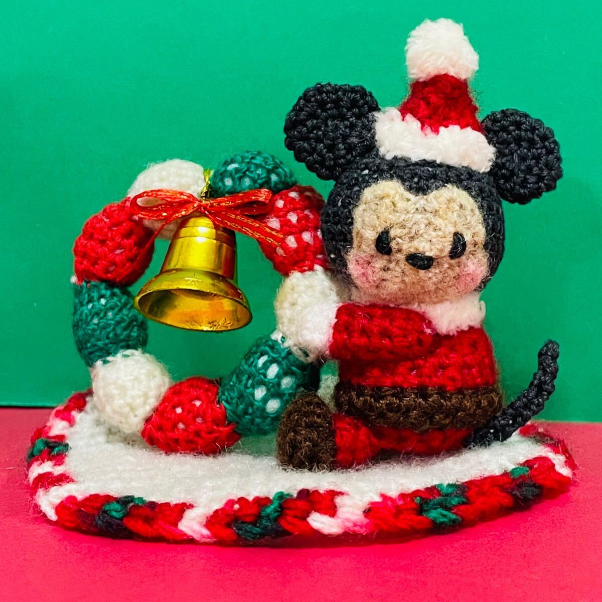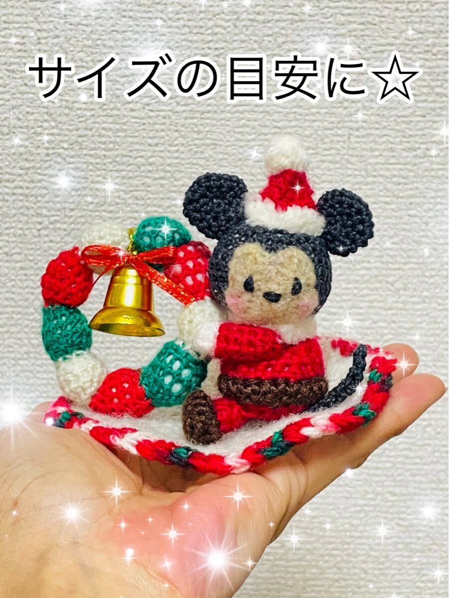 横向きお座り体制のツムフェイスなミッキー風あみぐるみをサンタさんコスチュームにお着替えをさせて仕上げました☆