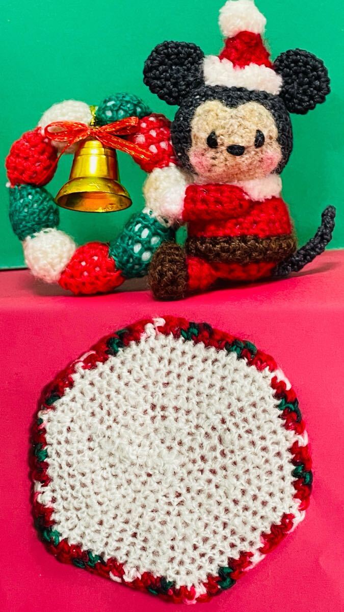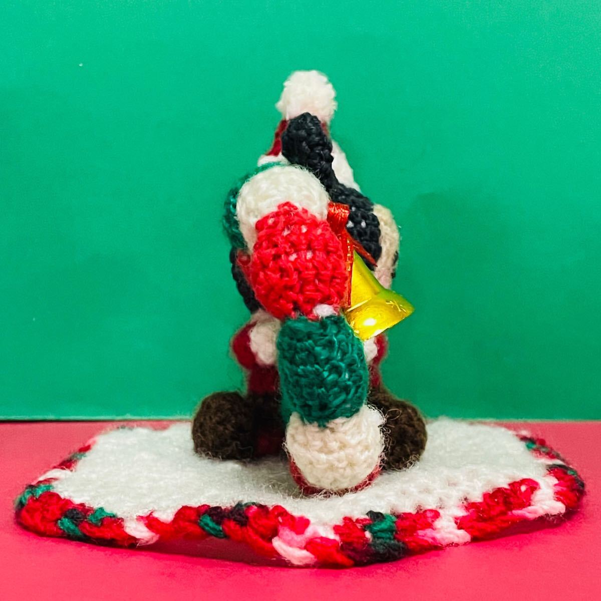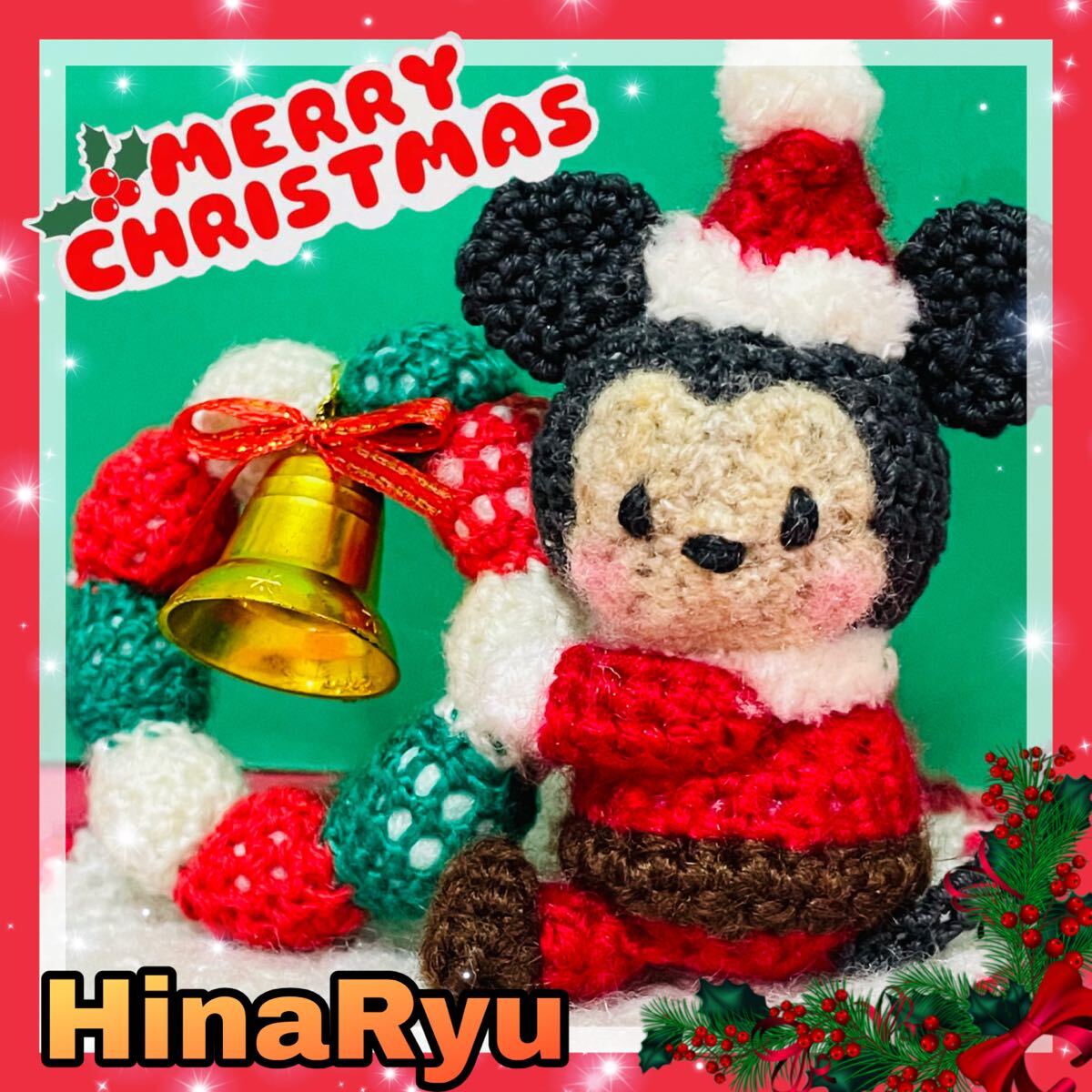 横向きお座り体制のツムフェイスなミッキー風あみぐるみをサンタさんコスチュームにお着替えをさせて仕上げました☆