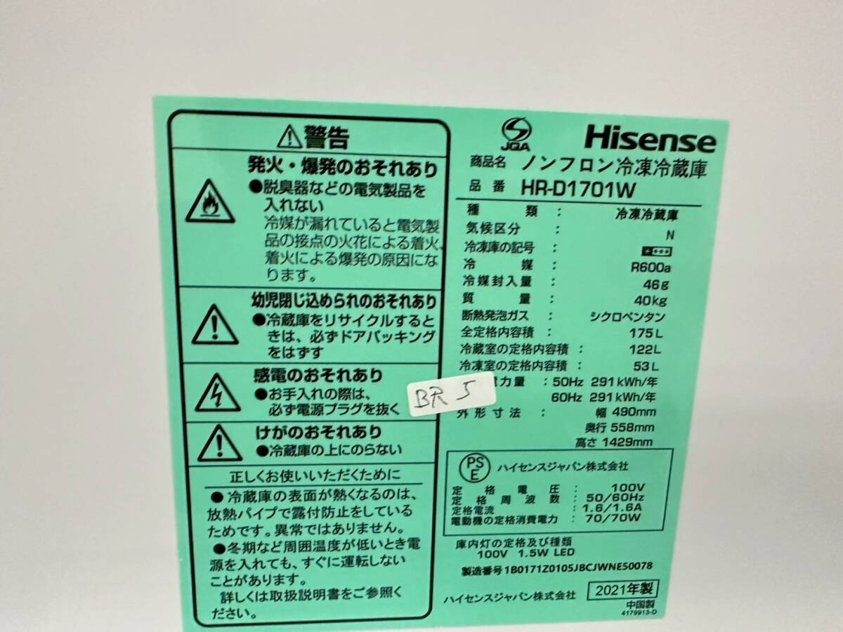大阪送料無料★3か月保障付き★冷蔵庫★ハイセンス★2ドア★2021年★HR-D1701W★BR-5