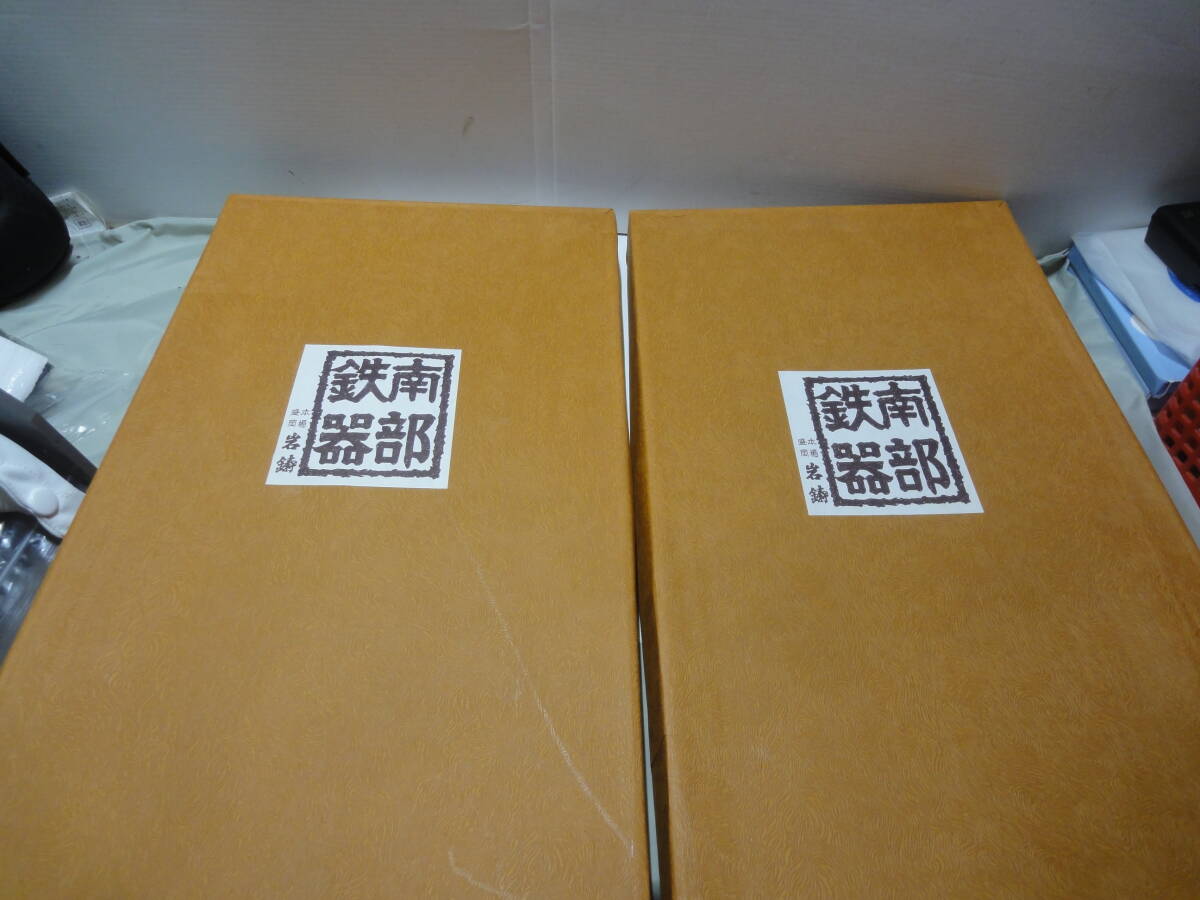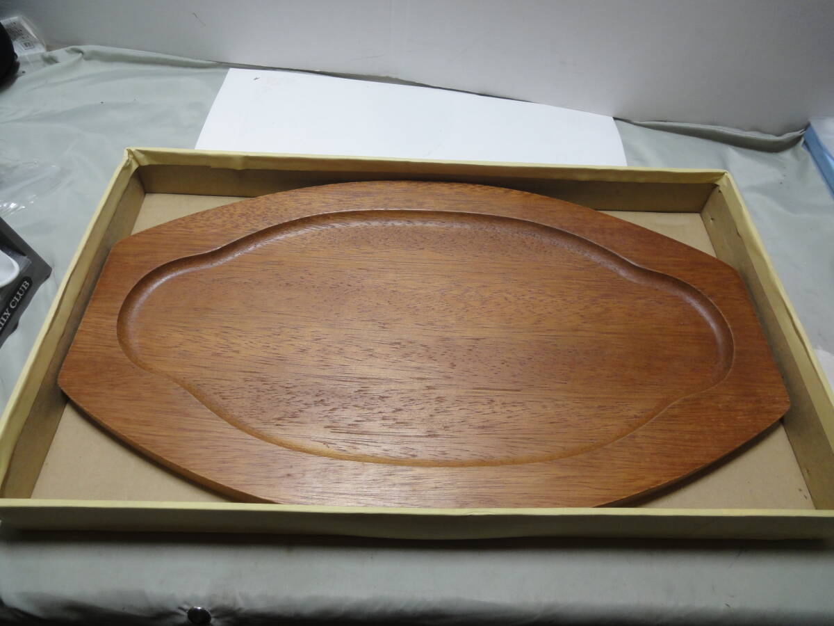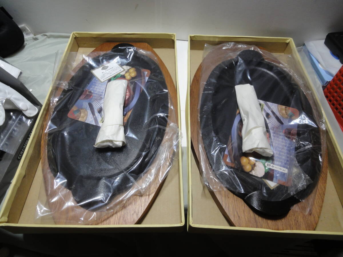 【岩鋳 南部鉄器 ステーキ皿(大)約33x19cm 取手・木製受け皿付き 2個セット】未使用品