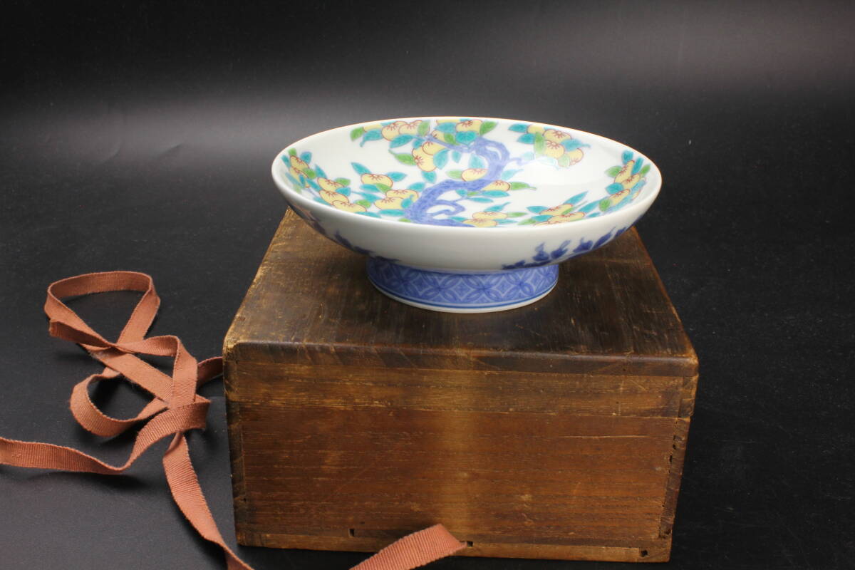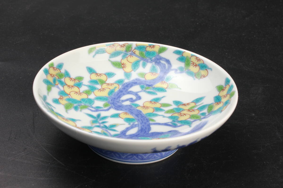江戸時代に製作された古鍋島の色絵皿です。小皿ですが、絵付けはしっかりしています。釉薬は青みがかっています。