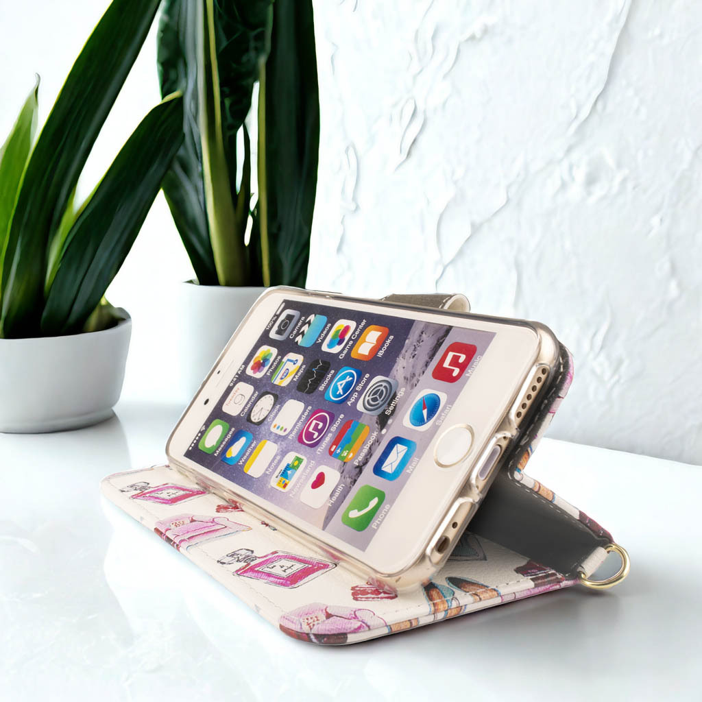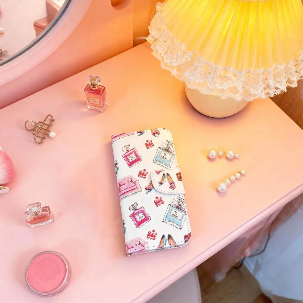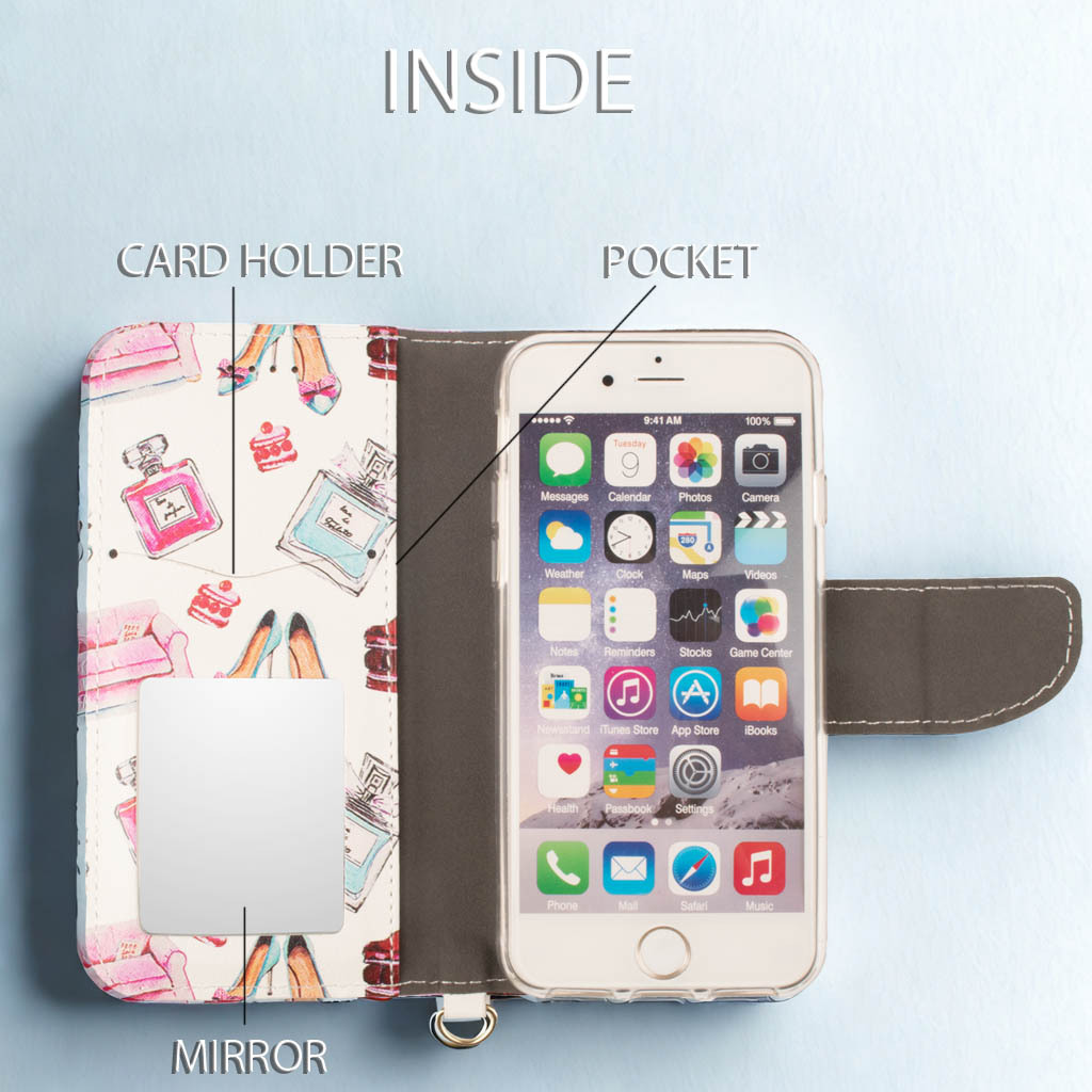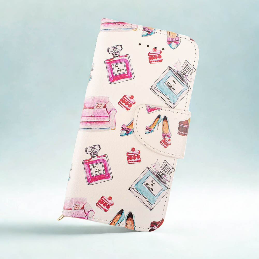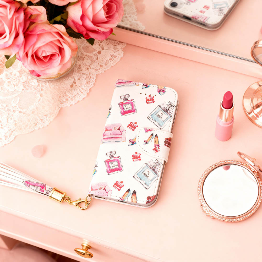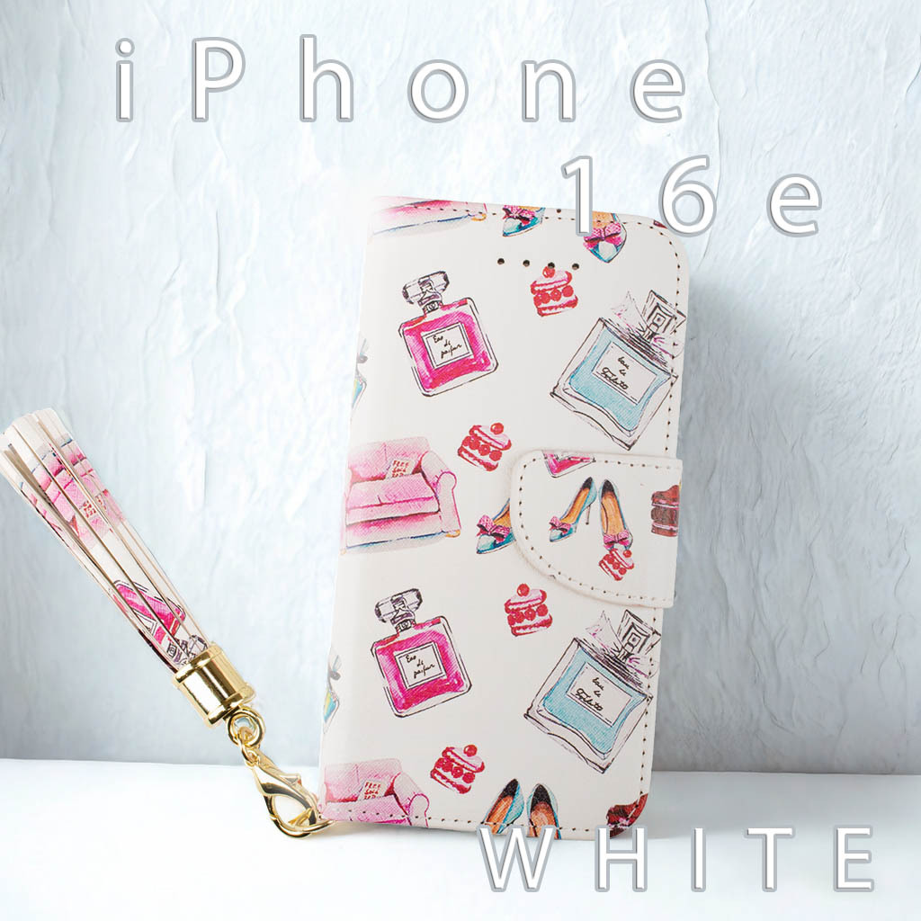 iPhone16e ケース 手帳型 白 コスメ柄 かわいい iPhone 16e カバー アイフォン16e ミラー ストラップ レザー 送料無料 安い スマホケース
