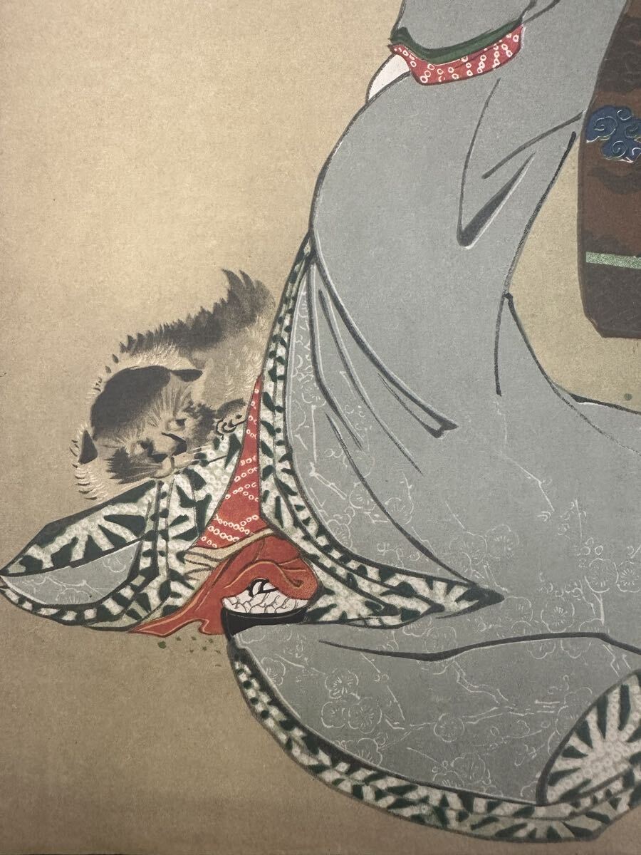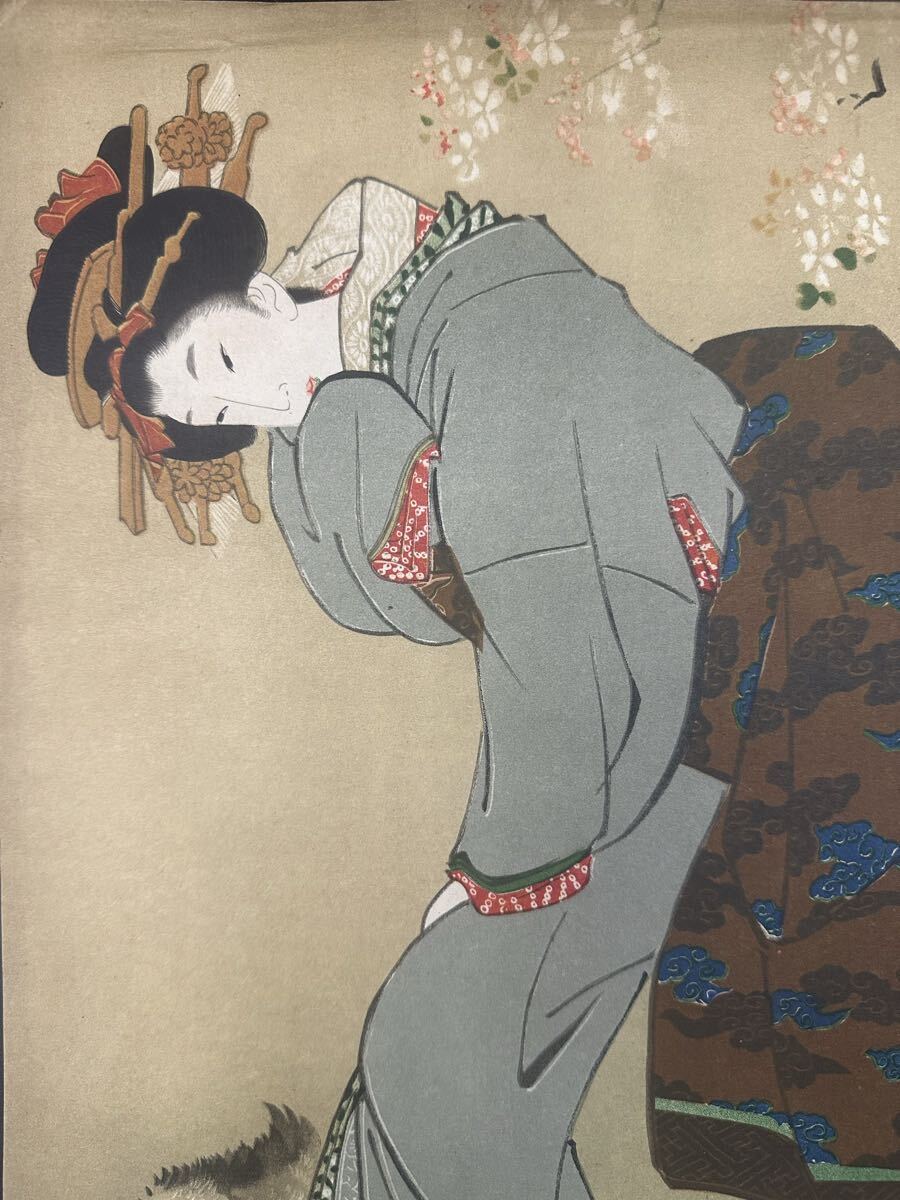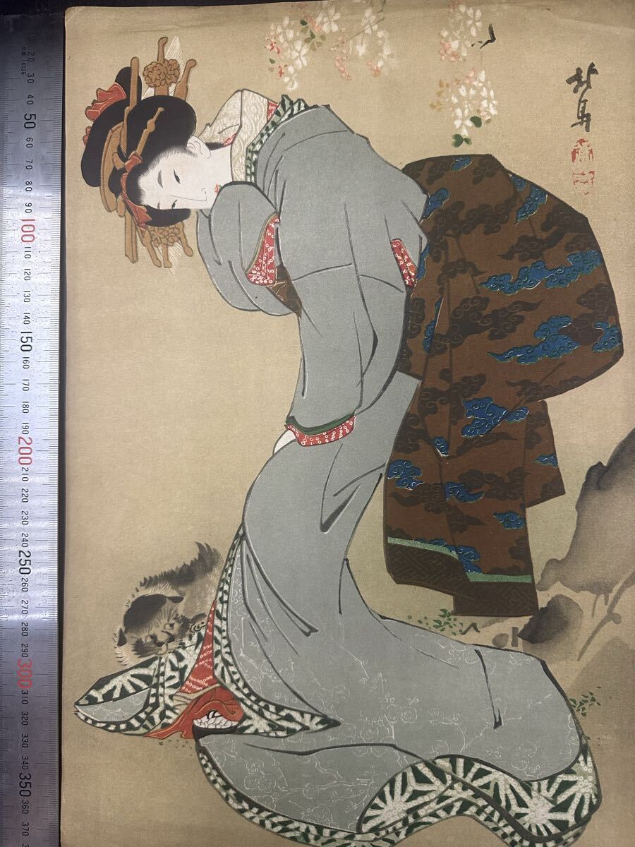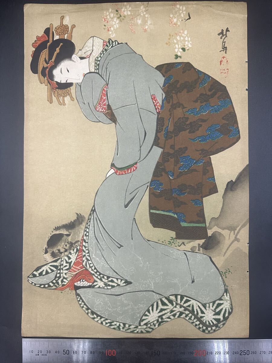 【真作】大正期 浮世絵木版画 喜多川歌麿「美人と猫」美人画 大判 錦絵 保存良い