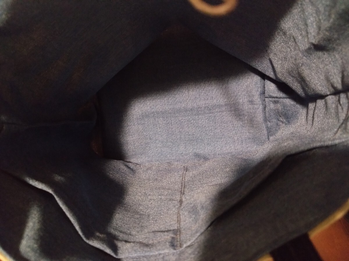 バックの内布はデニム調のTC生地です。ポケットは内側に2つ付けました。バックの口はワックスコードとココナッツボタンでとめれるようにしています。かわいいですよ♪