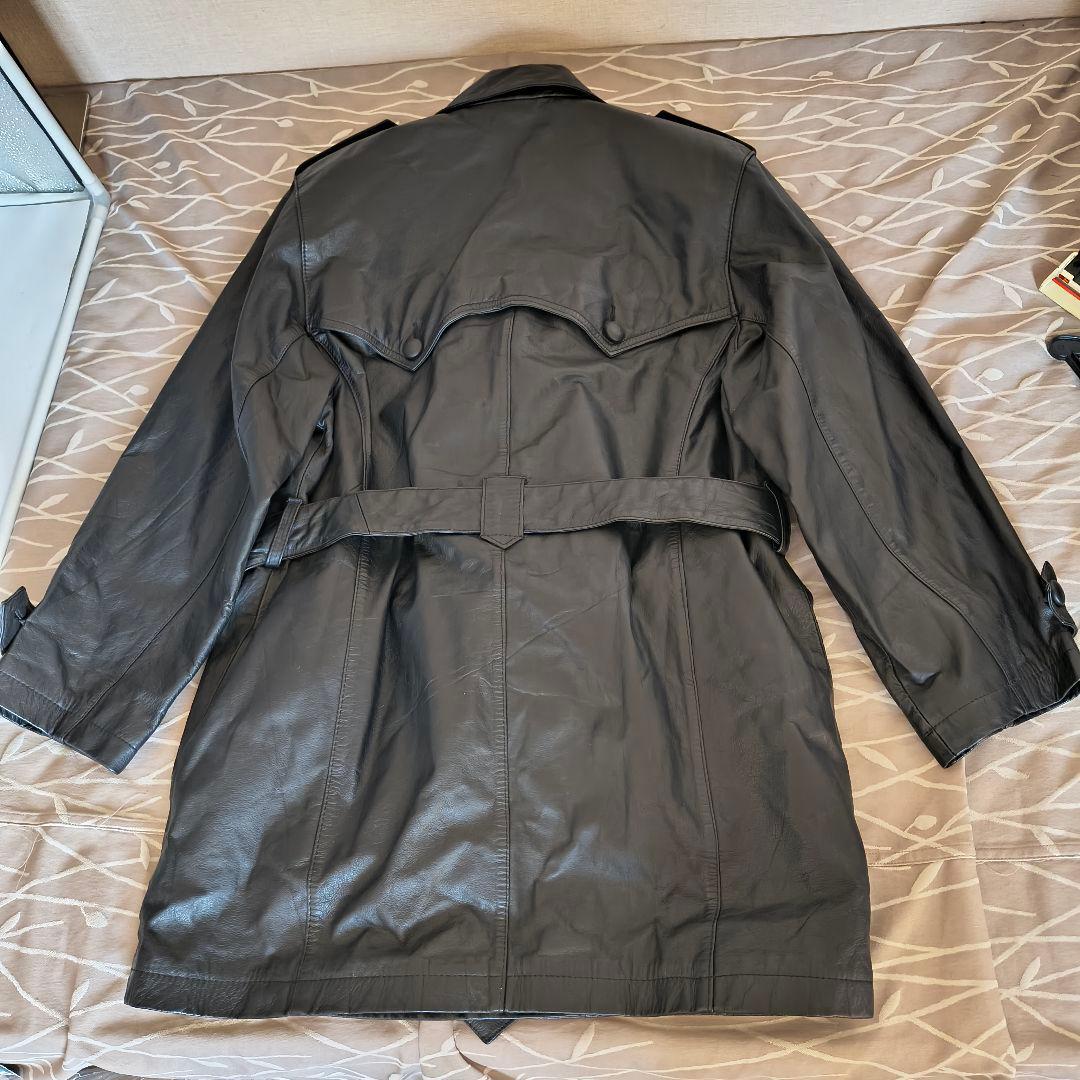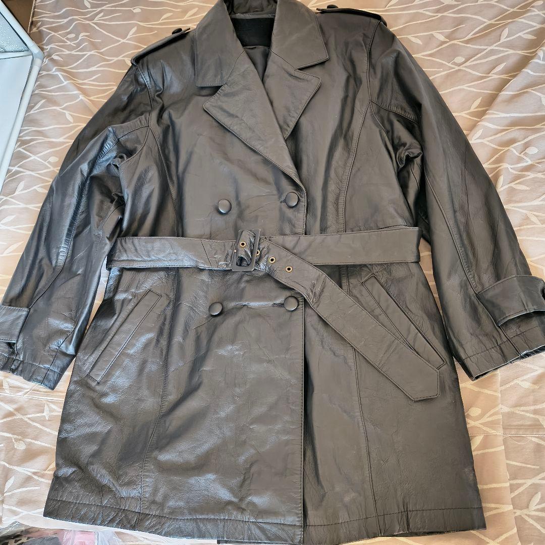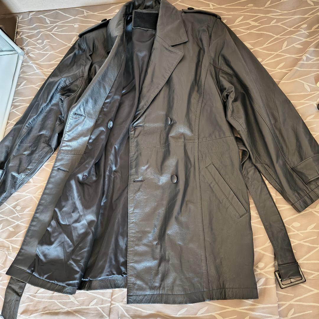 ブラックのダブルブレストトレンチコート、ベルト付きでスタイリッシュ。