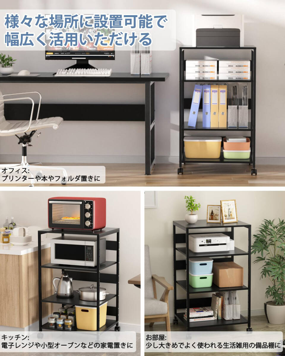 【シンプルなブラックでどんなインテリアにも調和】 プリンターワゴン A3対応 4段収納ラック キャスター付き オフィス家具 ブラック