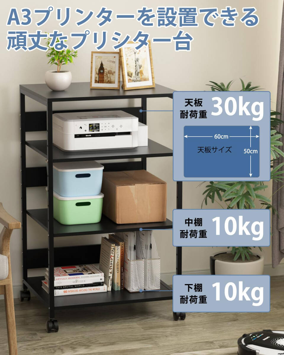 幅60cm・奥行50cmのコンパクト設計ながら、A3対応プリンターもしっかり支える耐荷重80kgのプリンターラック。