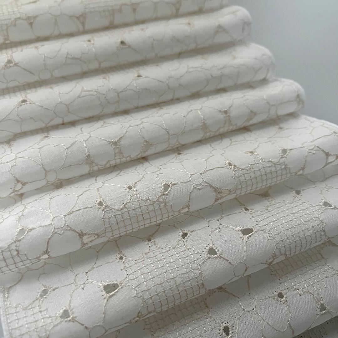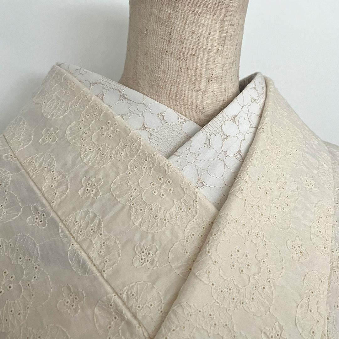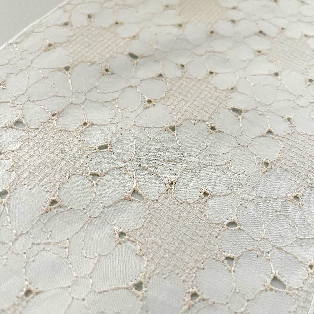 オフホワイトの柔らかな木綿地に光沢のあるキナリ色の糸で花や繊細な格子を刺繍した美しいデザインです。