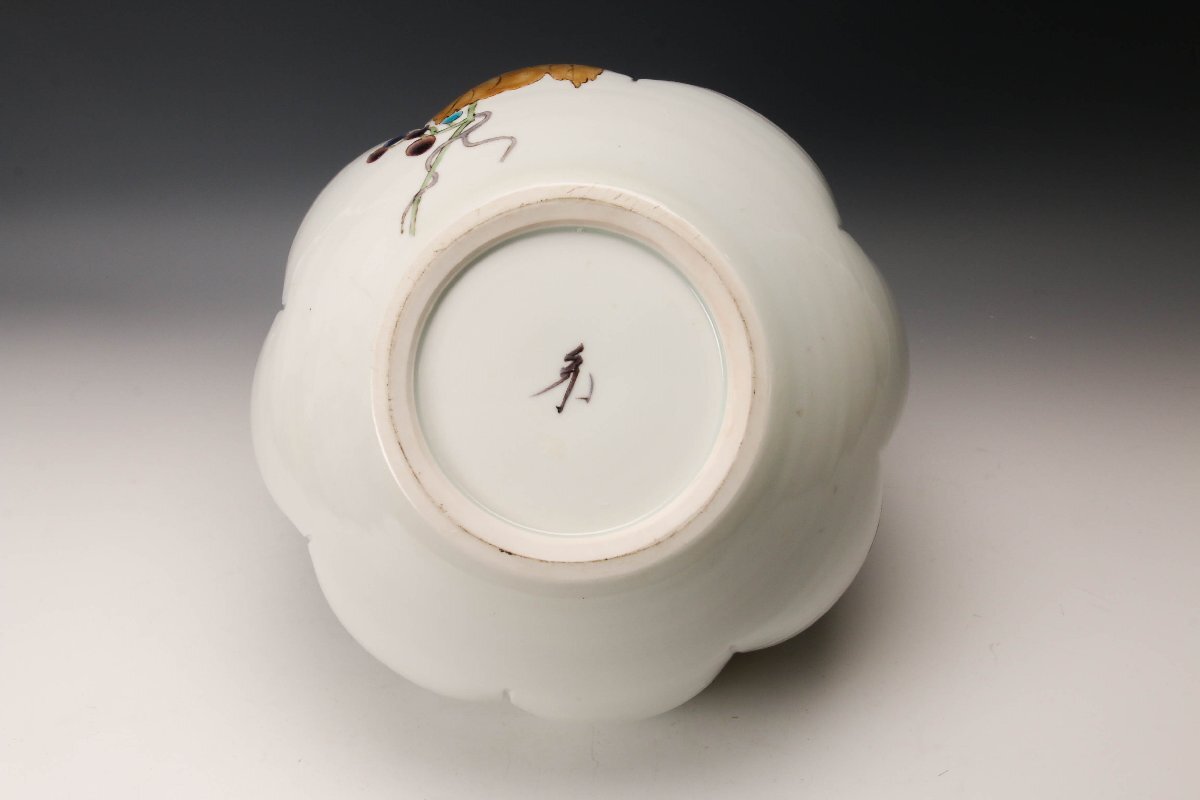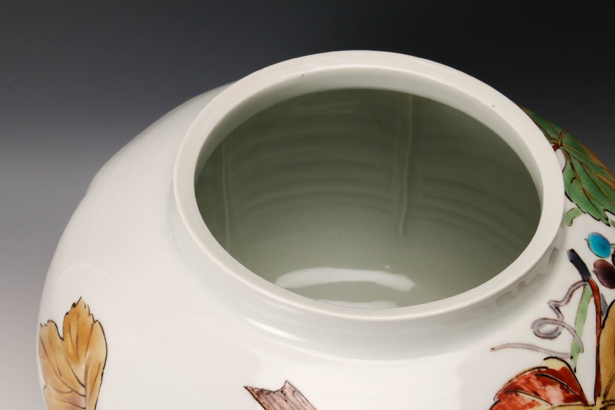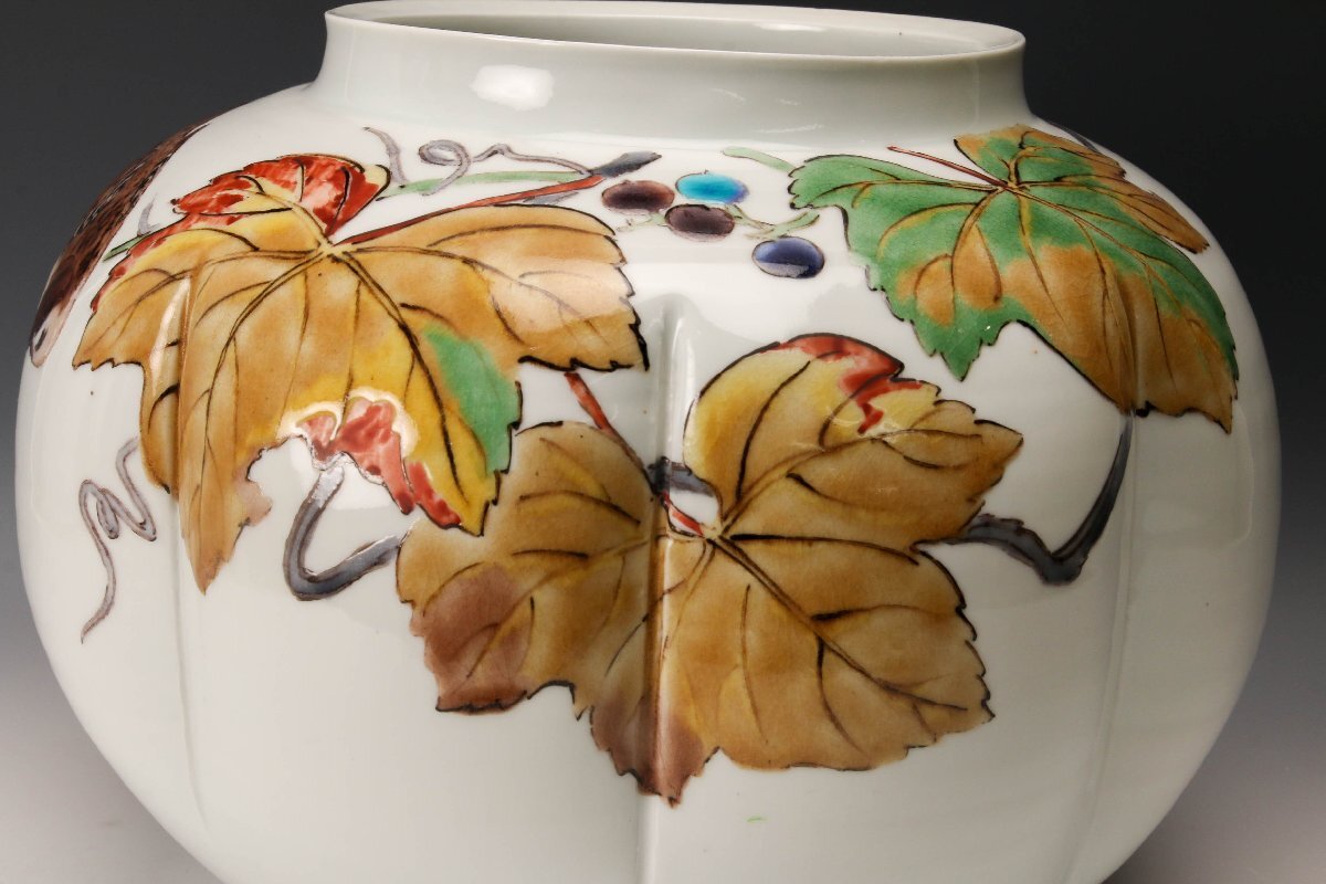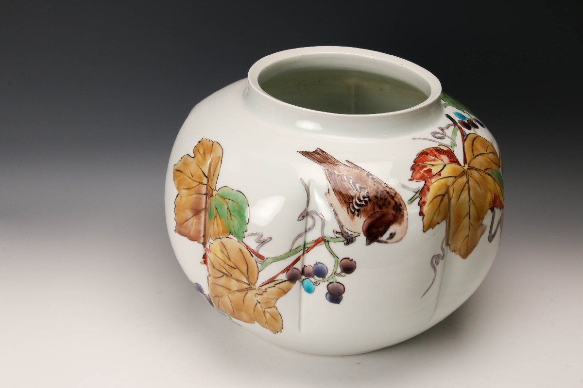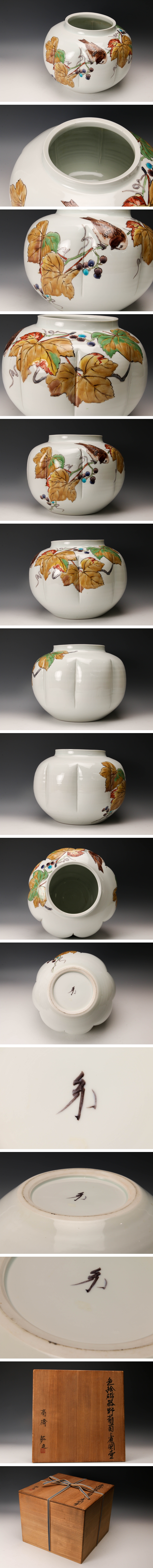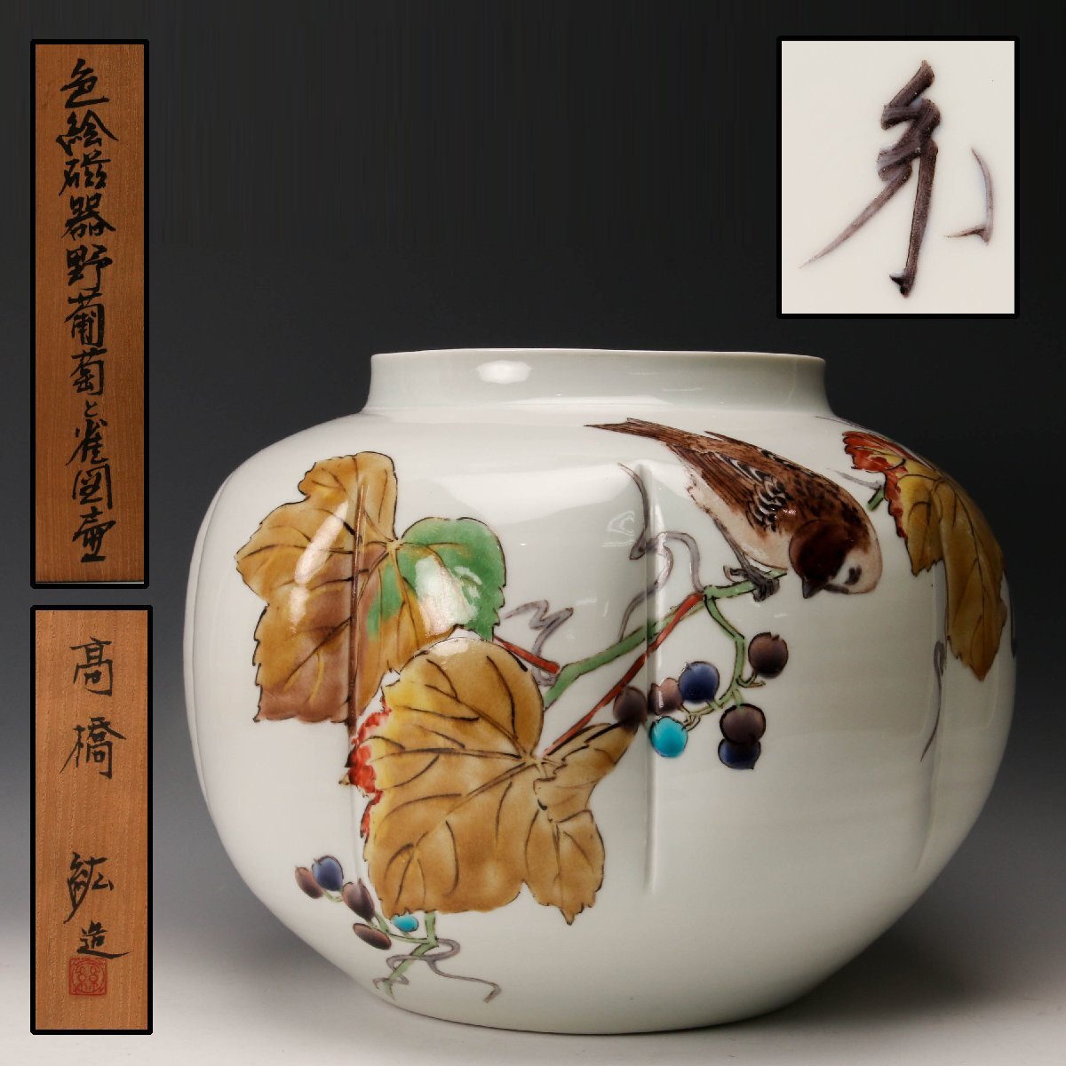 【佳香】高橋紘 幅30cm 色絵磁器野葡萄と雀図壷 共箱 本物保証