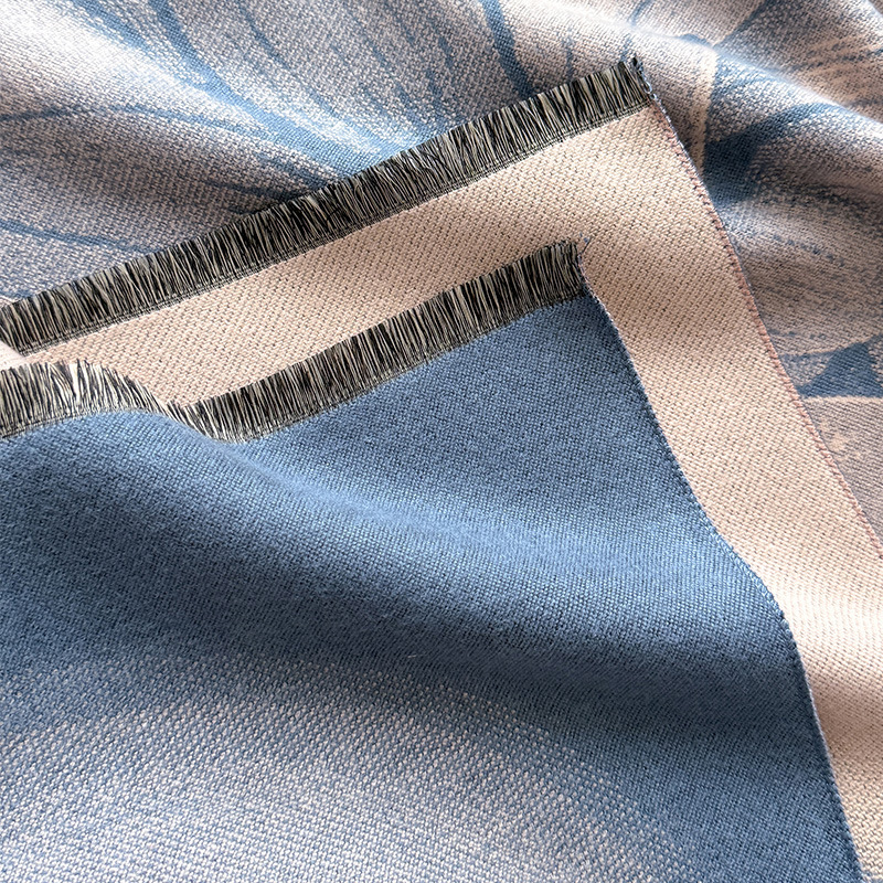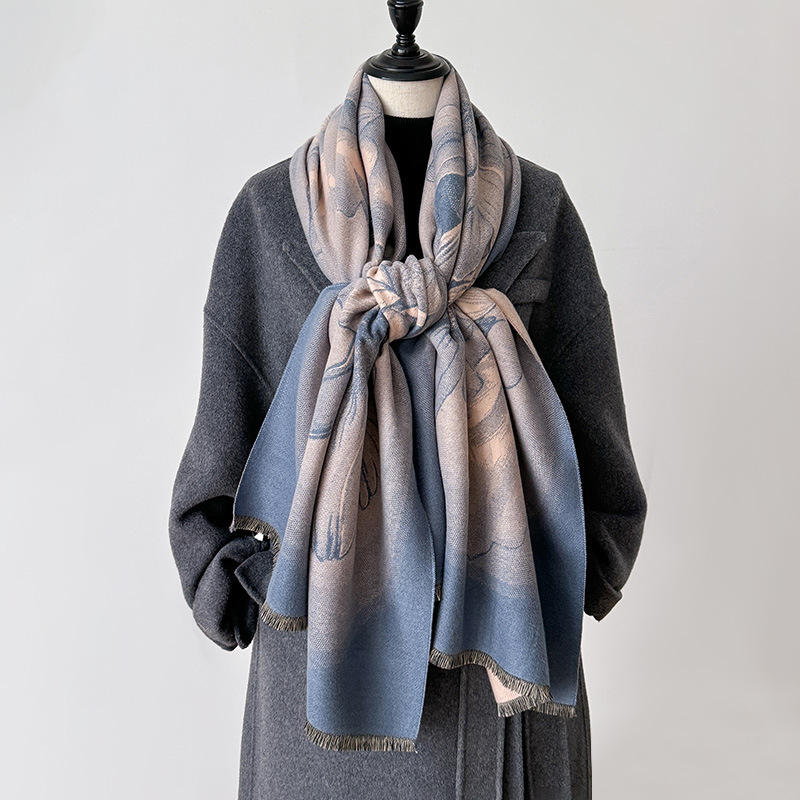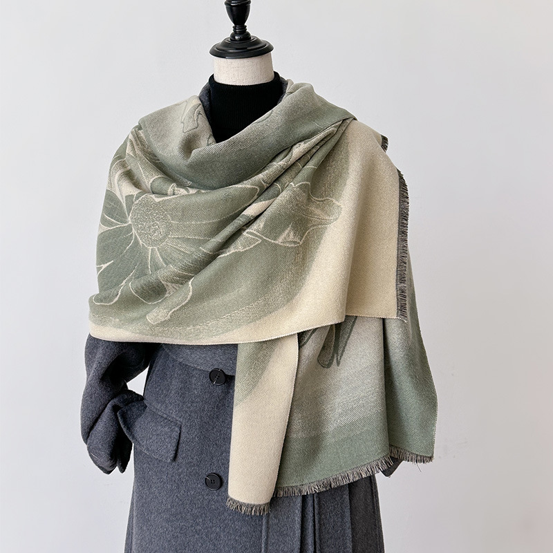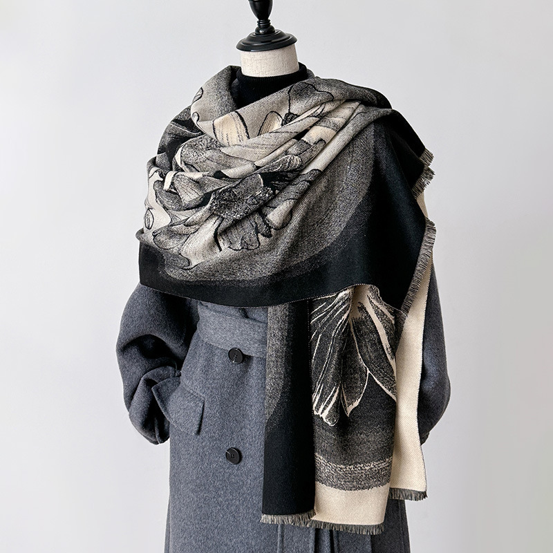 大判やや厚手リバシーブルフラワー柄入りストール/マフラーです。ソフトな風合い、美しい光沢感がある、シンプル